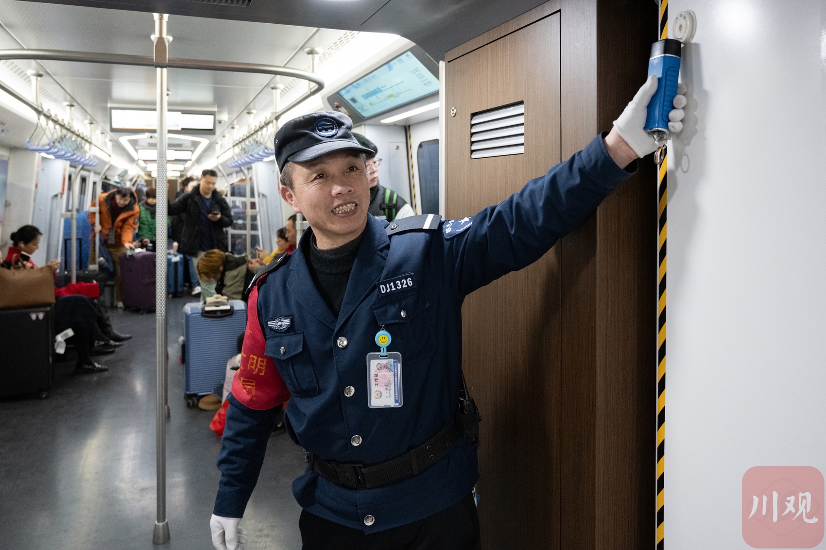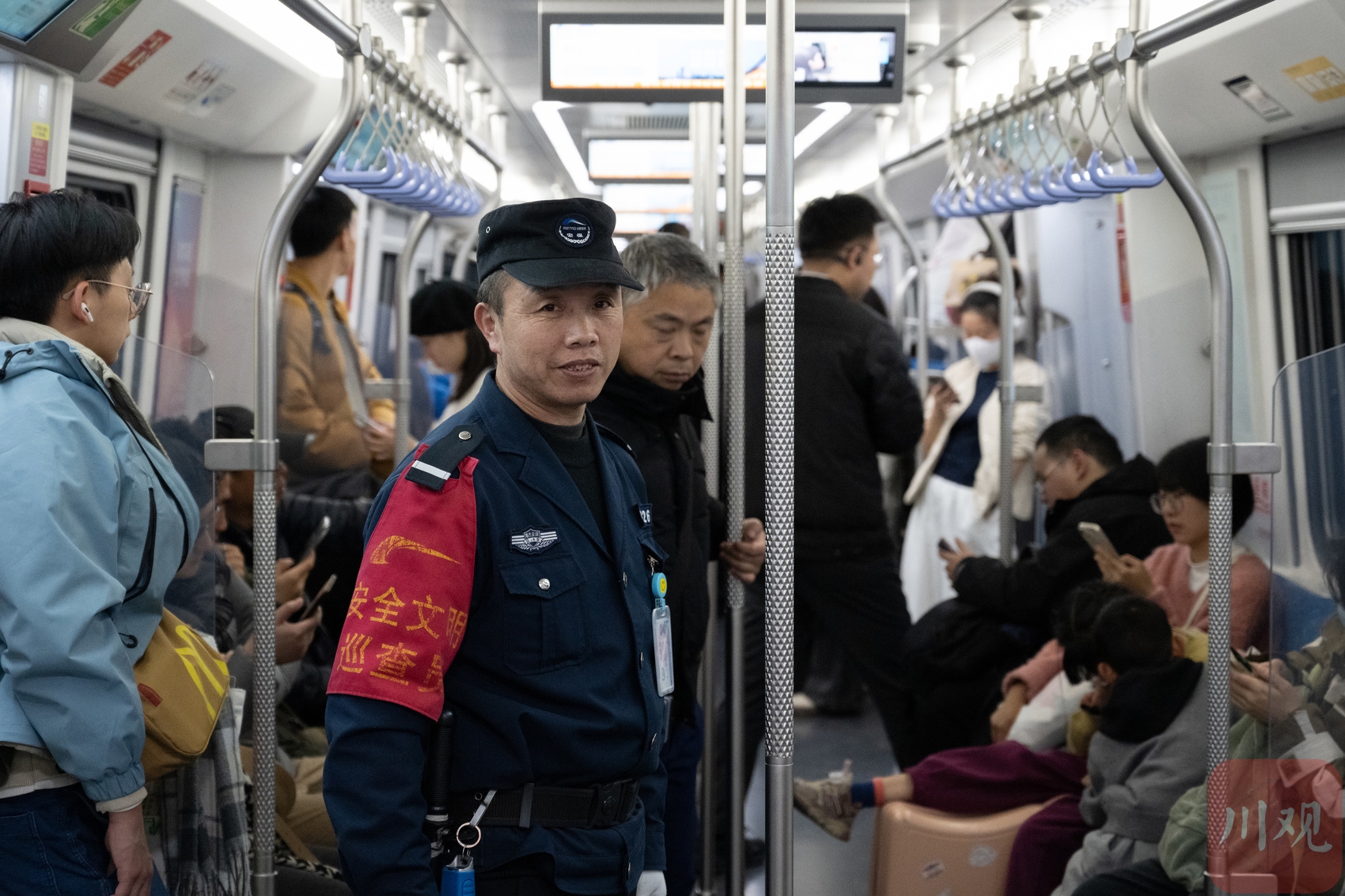 2月5日,地铁安全文明巡查员钟师傅在成都地铁18号线例行巡查,保障地铁车厢秩序。