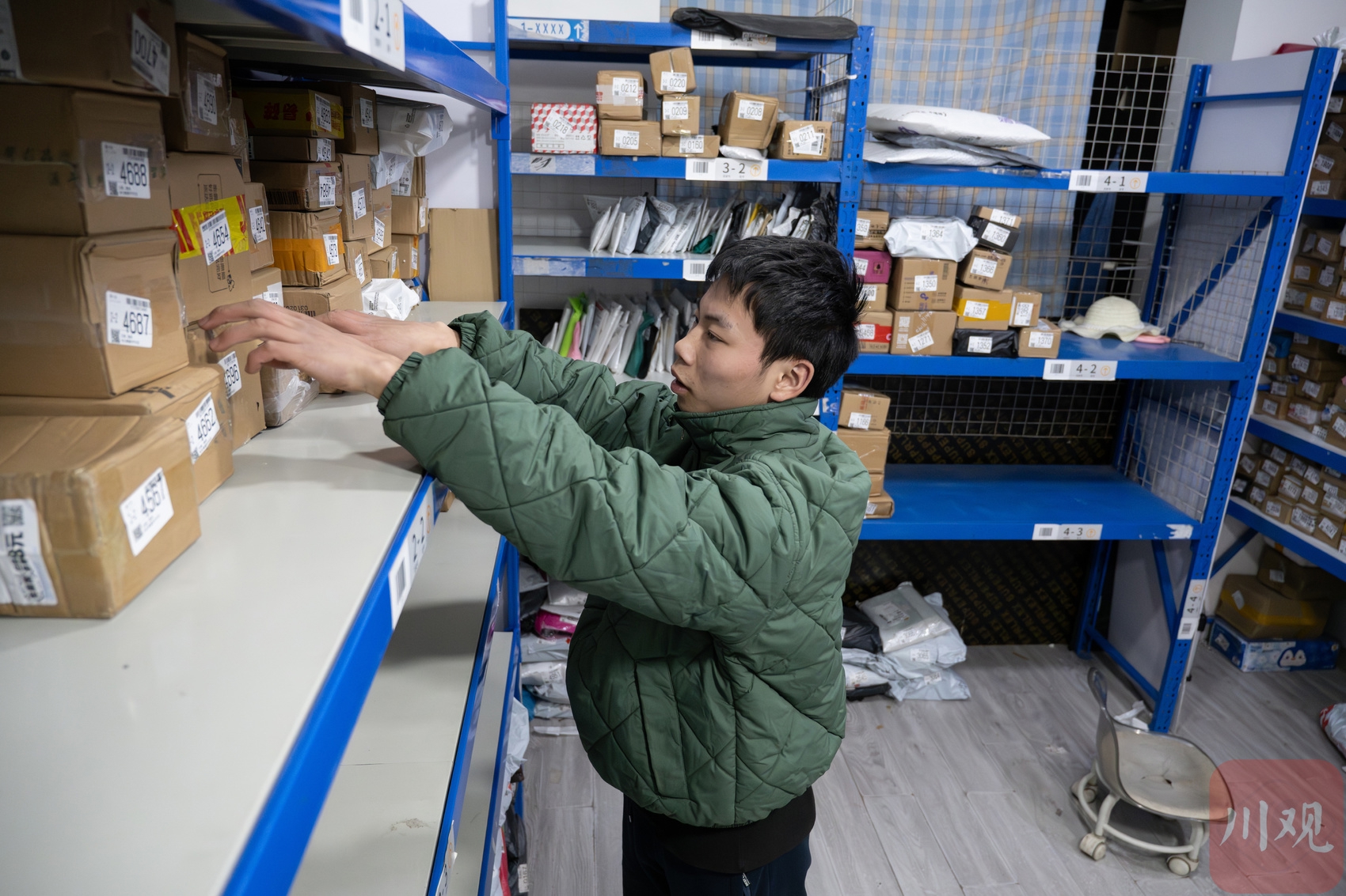 2月5日,快递小哥蔡佳鑫正在整理等待取件的快递。