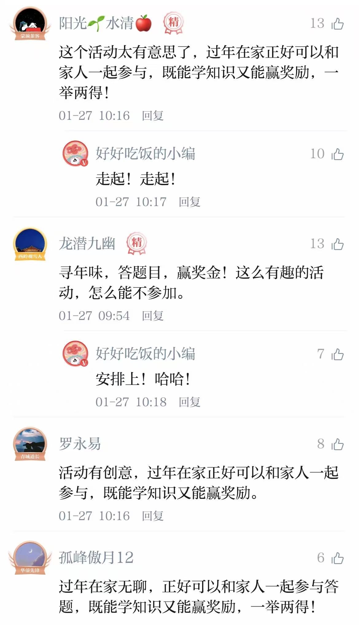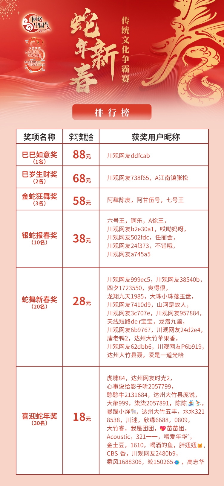 本次“蛇年新春传统文化争霸赛”活动积分按比例计入2025年“网络中国节”“巳巳如意闯关有礼”活动总排行榜。待今年重阳节活动结束后,将对总排行榜排位靠前的用户作出奖励。