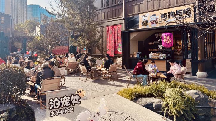 初三上午,在成都铁像寺水街,快闪店内,逼真的猫狗毛绒玩偶、印着熊猫图案的盖碗咖啡、以“修狗”为主题的文创周边,让年轻人直呼“萌化了”。点一杯“熊猫拿铁”,捧着《云养一只修狗》的治愈绘本,拍照打卡的年轻人在这里找到了一种“松弛感”的春节打开方式。