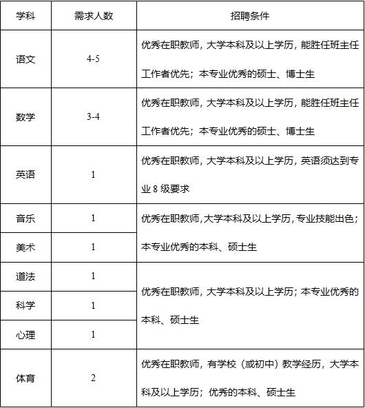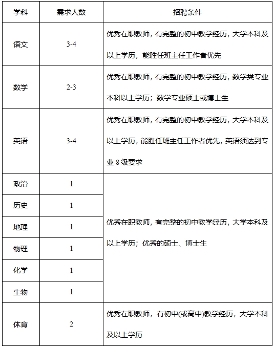 本次公开招聘为编制外招聘,招聘岗位为:语文、数学、英语、音乐、体育、美术、科学、信息技术学科教师。