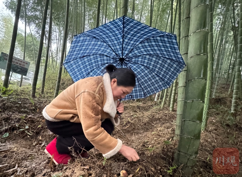 邬高兰蹲在竹林里察看菌子长势。杜杰 摄