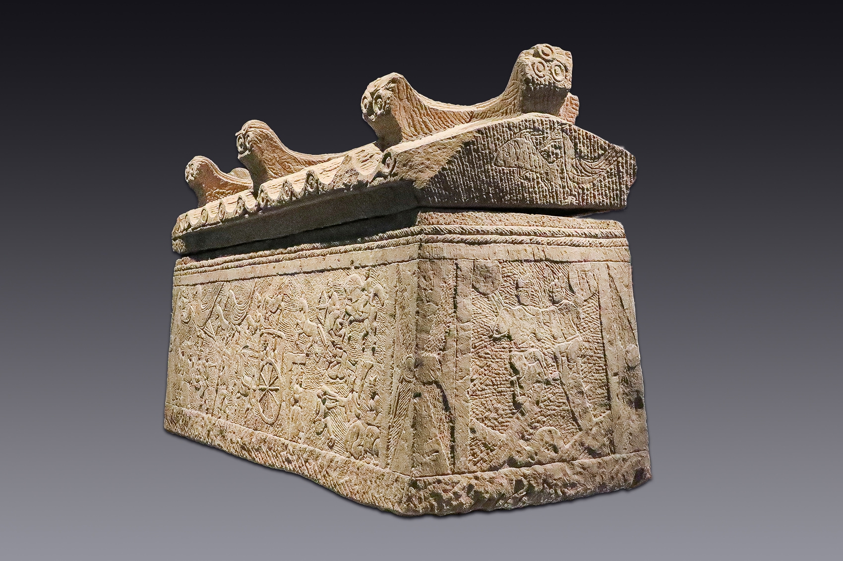 在宜宾市博物院,国家一级文物东汉斑竹林画像石棺在展览中单独陈列。这件石棺的后档部分刻划的便是伏羲女娲的形象。他们人首蛇身,蛇尾交缠的同时,手中托举着太阳和月亮。在日月其间,还分别刻有规和矩两件工具。古人认为,伏羲女娲以阴阳化育万物,为世界定下规矩。