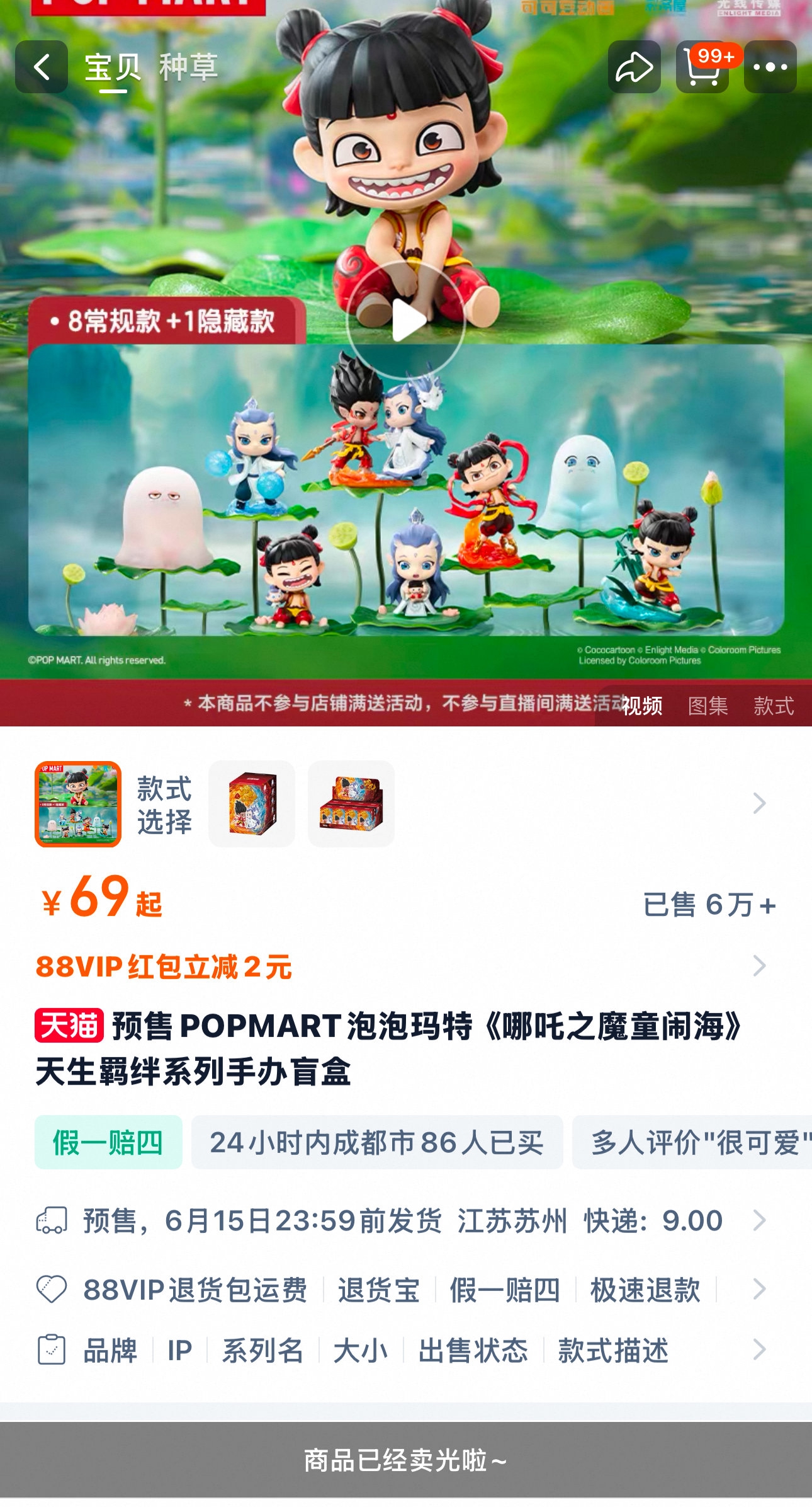 四川在线记者注意到,泡泡玛特某平台旗舰店内的销售页面显示,《哪吒之魔童闹海》天生羁绊系列手办盲盒销量已超6万,但目前链接已下架,而详情页内的商品发货时间为预售——6月15日23:59前发货。店铺客服表示,该盲盒目前已售完无货,且暂未收到后续的补货消息。泡泡玛特官方小程序“泡泡玛特”“泡泡抽盒机”内显示,目前成都的17家泡泡玛特线下门店均已售空该盲盒,线上也暂无销售。泡泡玛特官方app中还有相关预售提醒:预计2025年6月15日00点起开始发货。