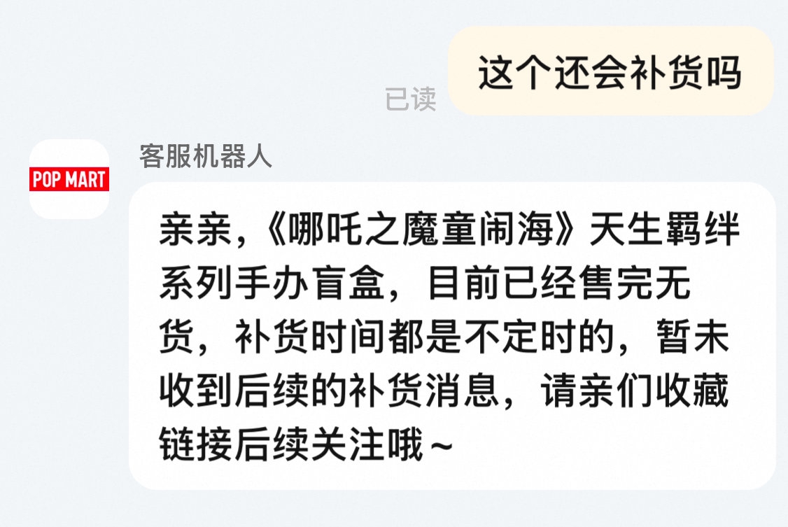 店铺客服表示,该盲盒目前已售完无货,且暂未收到后续的补货消息