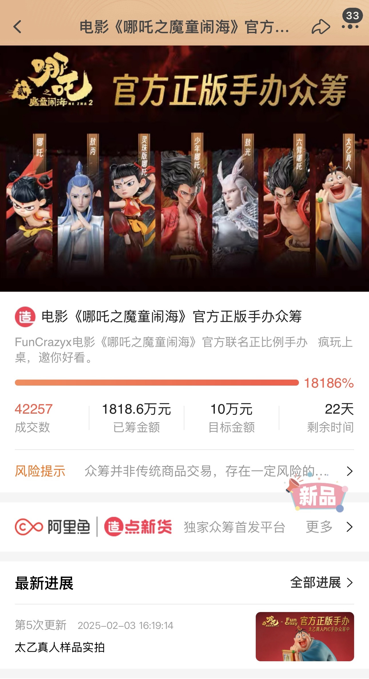 哪吒官方正版手办众筹链接显示,截至2月7日13:00,已有4万2千余人购买了官方正品手办,已筹金额达1818万元