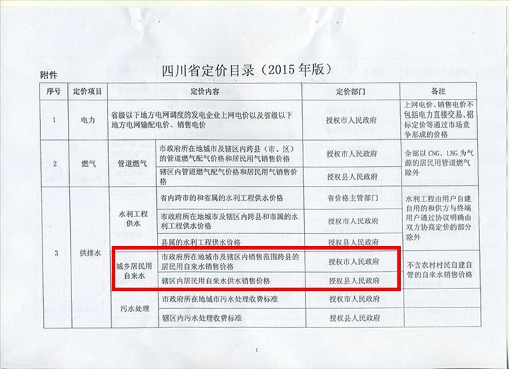 根据省发展和改革委员会于2015年9月公布的《四川省定价目录(2015年版)》,城乡居民用自来水的定价权,被授权给市、县人民政府。