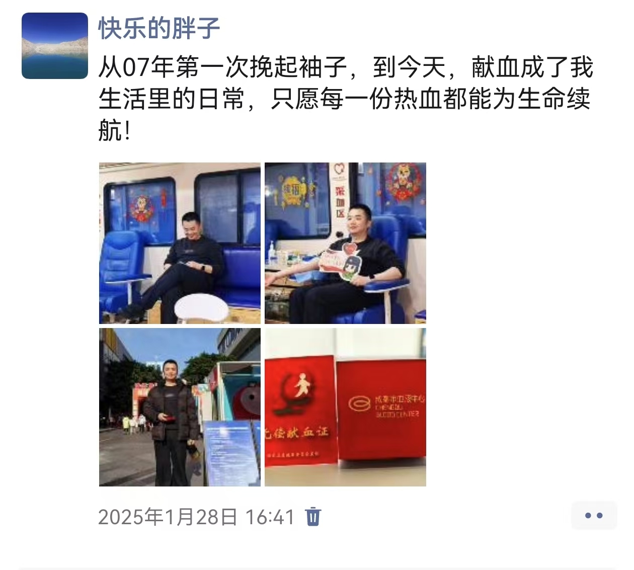 韩晓蓉还带动弟弟献血,身边的红十字会志愿者也受到鼓舞,一同参与献血。“我常说,我献血,我健康。有规律地献血,就像做‘定期体检’。” 同一天,38岁的成都市民、金奖获得者杨米山也来到献血点位。“很惊喜,现在献血的金奖获得者能在华西医院享有绿色就医通道,更让我感受到社会对这个群体的重视。”2007年,20岁的杨米山在锦江暑袜中街献血房车看到人们排队,便跟着填表、献血,此后18年,这里成了他献血的“老地方”,累计献血量达9400毫升。“从2007年第一次挽起袖子,到如今献血成为生活中的日常,我只希望每份热血都能为生命续航。”1月28日16时41分,他在朋友圈这么写到。