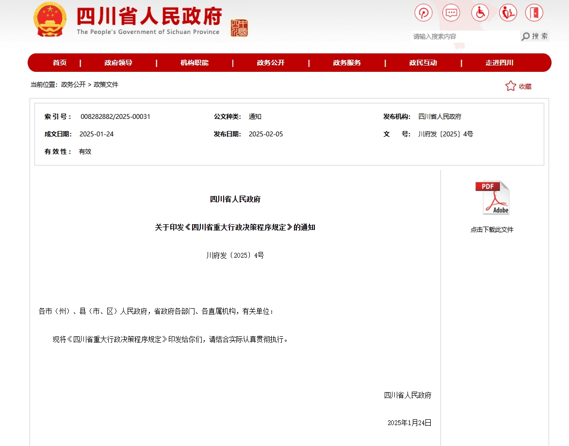 为贯彻落实《重大行政决策程序暂行条例》,进一步健全科学、民主、依法决策机制,规范政府重大行政决策行为,推进法治政府建设,日前,四川省人民政府印发了新修订的《四川省重大行政决策程序规定》(以下简称《规定》)。《规定》自2025年3月1日起施行,体例上基本与《重大行政决策程序暂行条例》各章对应,包括总则、决策目录、决策程序、决策执行和调整、法律责任、附则等部分,共6章81条。