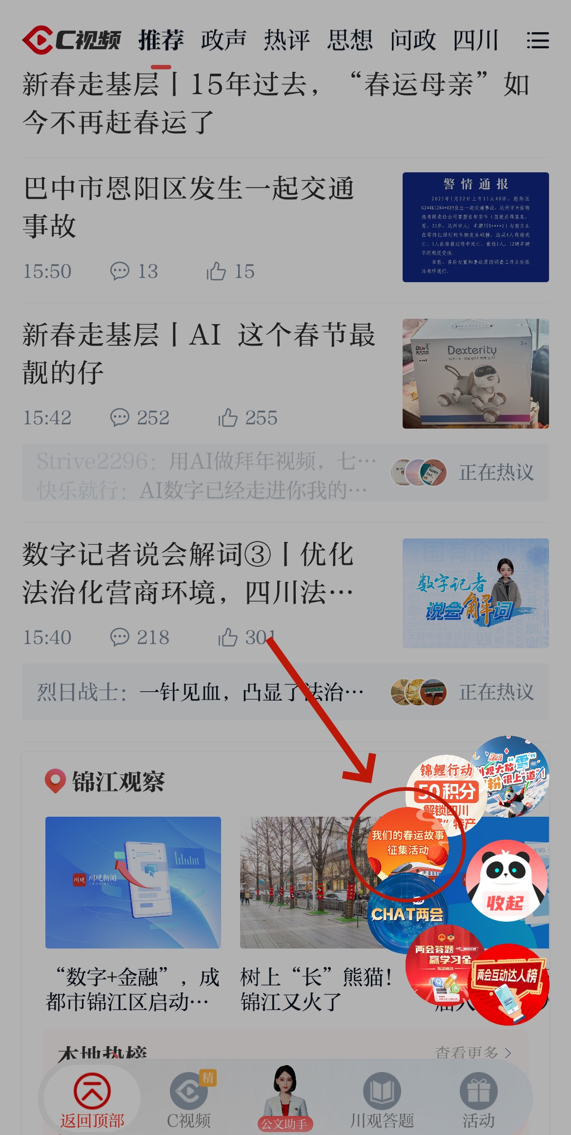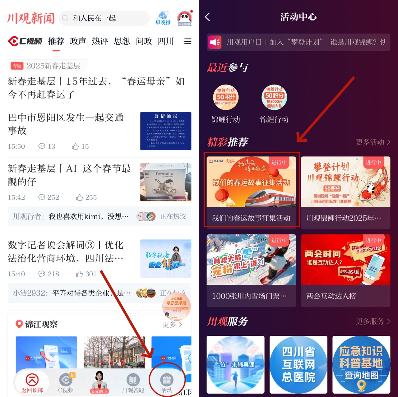方式二:在川观新闻首页,点击右下角“活动”,进入到“活动中心”,找到“我们的春运故事”互动活动图片点击参与,按照活动页面提示填写信息,提交作品即可。