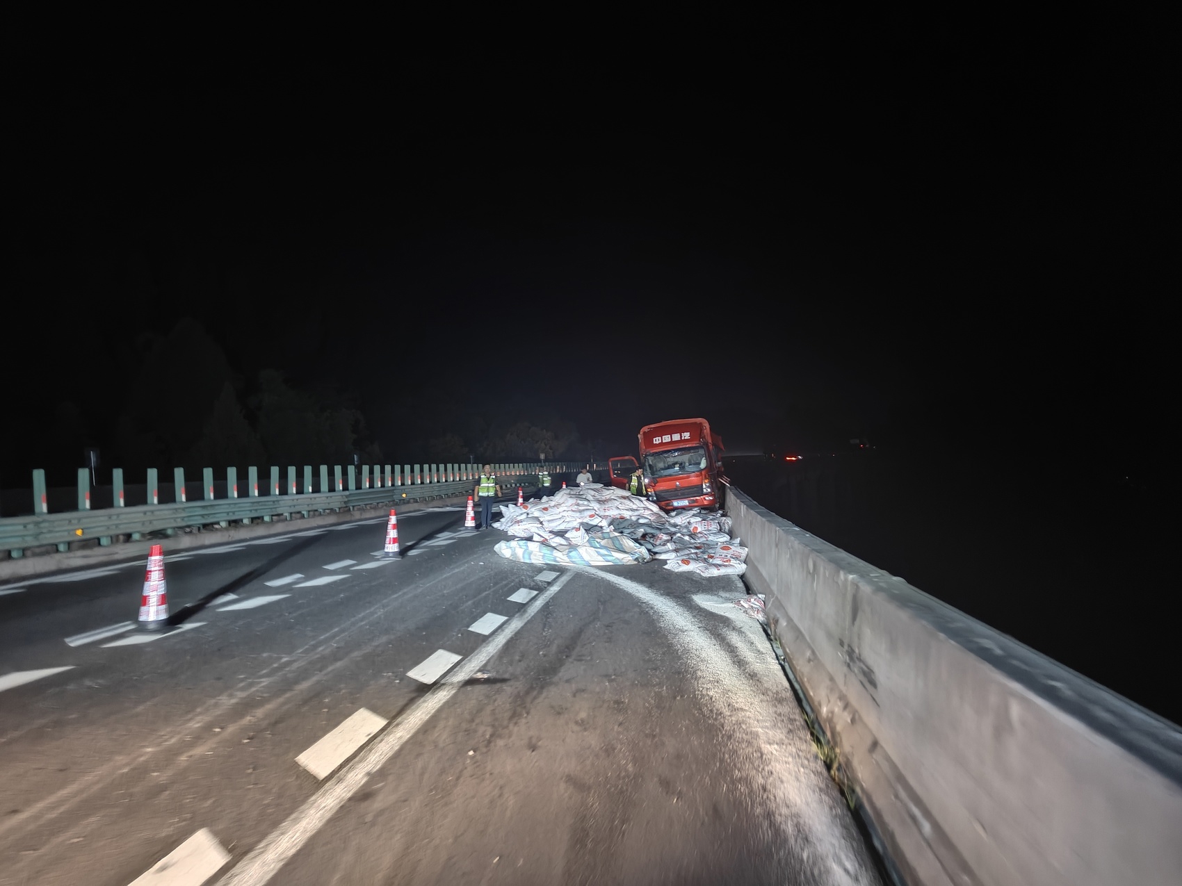 “当时车辆已经侧翻,车头靠近桥墩,车尾在马路中间。”据被救司机杜国欣回忆,车内还有一个12岁大的孩子,“受朋友委托,送其回老家。”高速上散落一地的是80多包肥料。