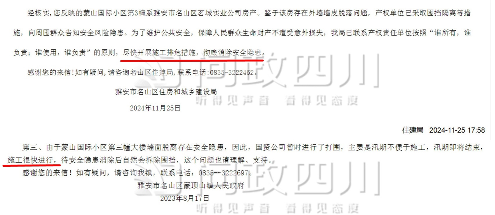 2023年8月和2024年11月,该网友就该问题反映两次,雅安市名山区蒙顶山镇人民政府和名山区住建局在网络平台分别回复:“汛期即将结束,施工很快进行”“尽快开展排危措施,彻底消除安全隐患”。