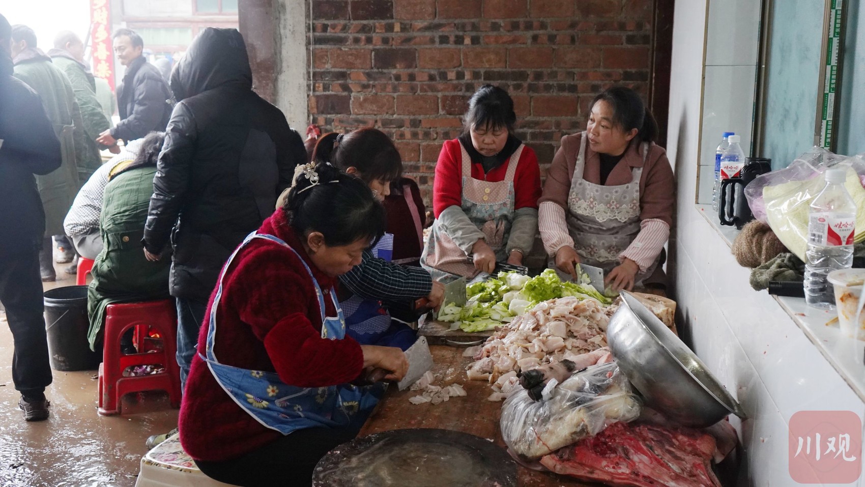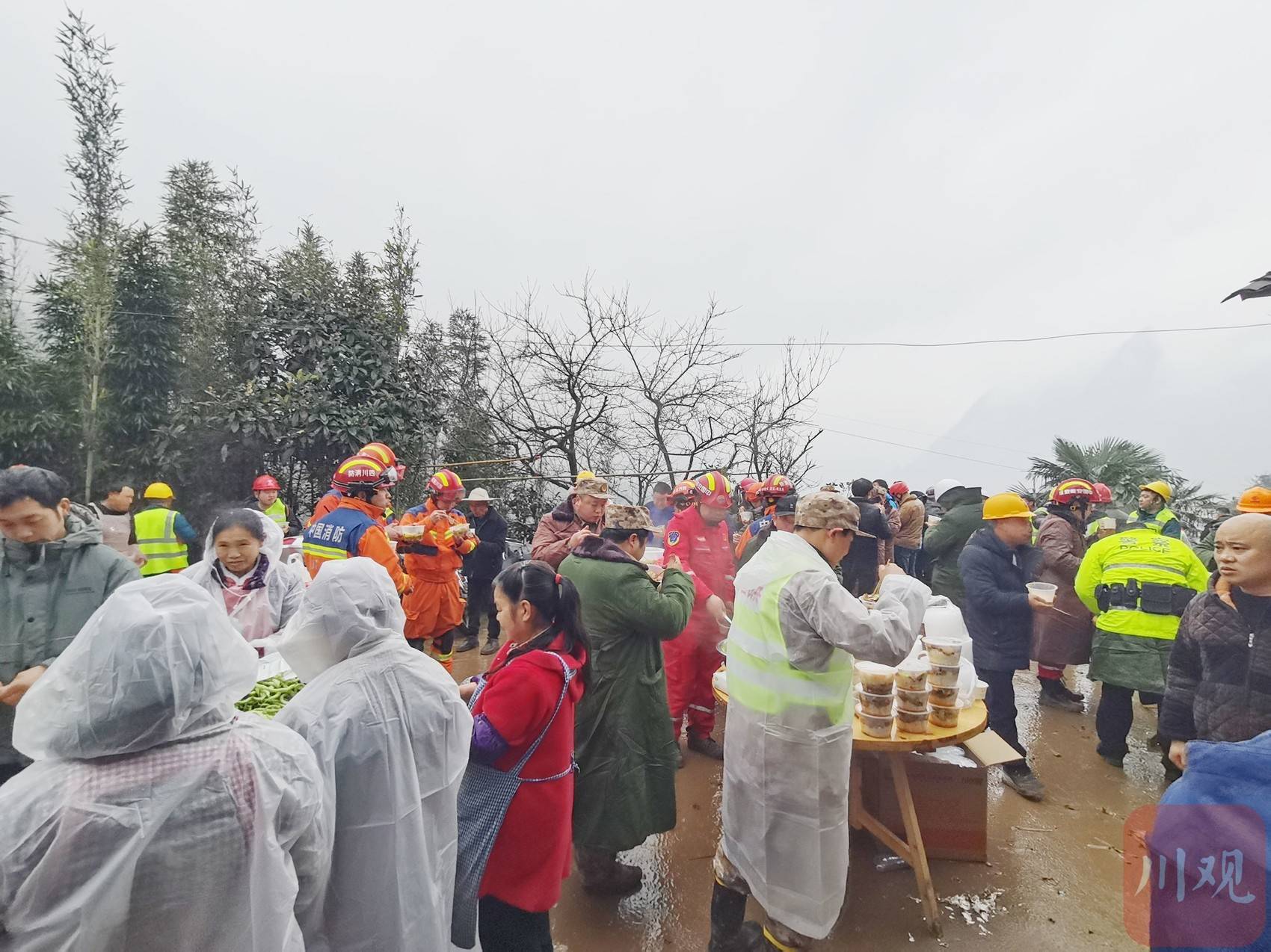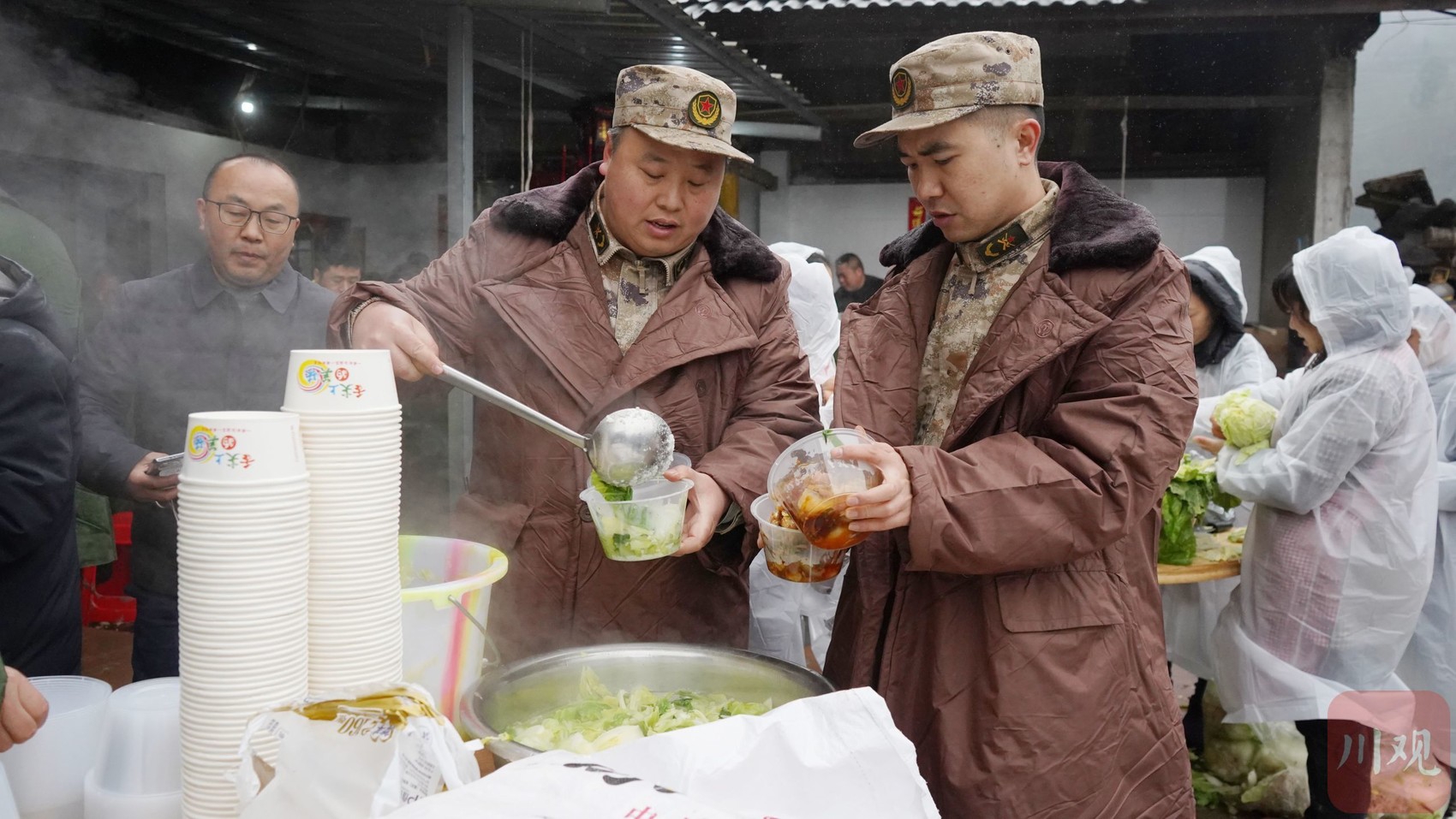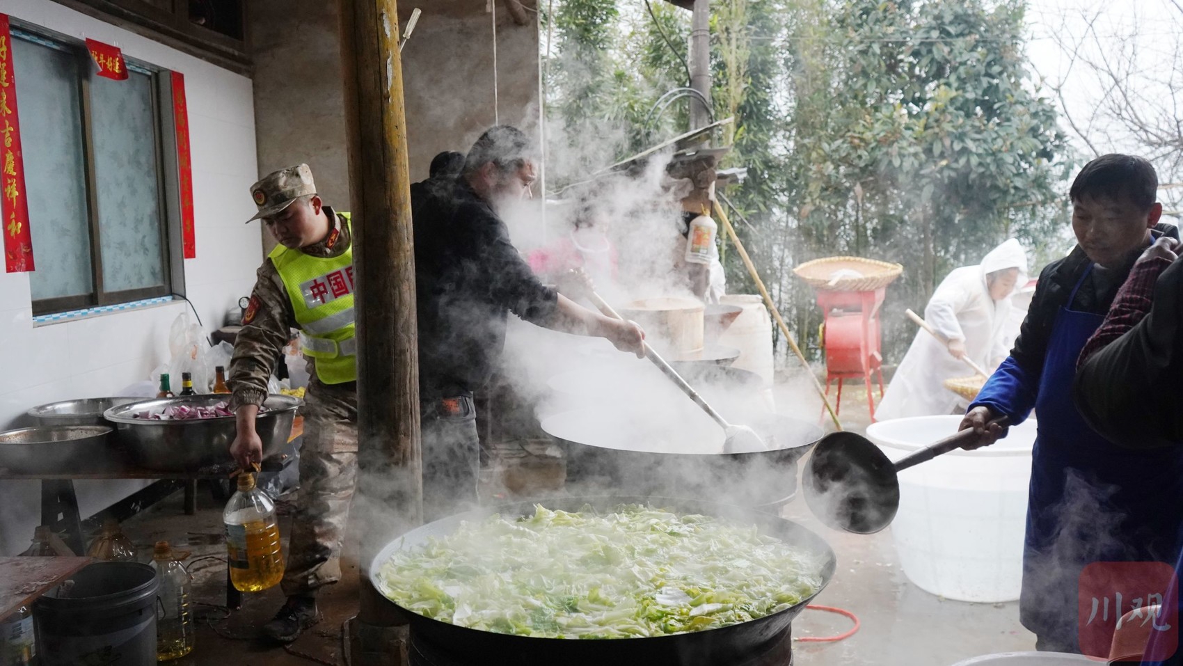 2月9日中午,在宜宾市筠连县沐爱镇金坪村2组山体滑坡点附近安置食堂里,武警、消防等救援队伍架起行军灶,炊事班成员与自发赶来的村民共同忙碌着切菜、炒菜、盛菜,让救援队员和群众一起吃上热乎饭菜。