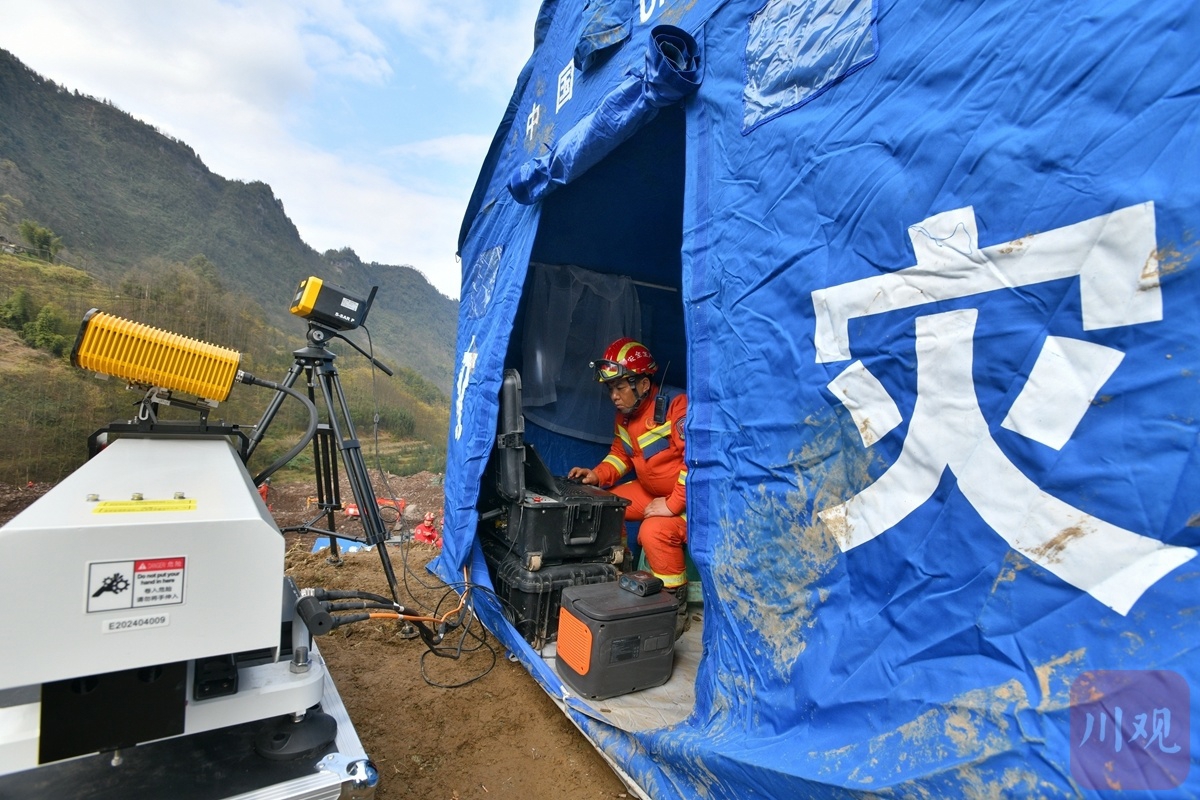 2月10日,在筠连县“2·8”山体滑坡灾害救援现场,各路救援的重型机械在坍塌体上有序作业,为保障在坍塌体展开救援的队伍安全,滑坡体破损的变形监测尤为重要。四川在线记者从国家隧道应急救援中国交建重庆队的工程部长袁林那里了解到,围绕整个坍塌体周围,布置了多点边坡雷达监测点。记者看到,边坡雷达在1.2米的滑轨上匀速运行,实时的山体变形数据为救援作业提供了安全保障。