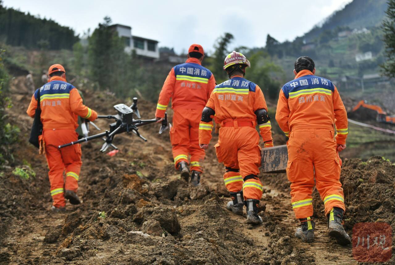在空中,一架红色的小型无人机不间断起飞,对整个滑坡区域开展巡航。王俊军告诉记者,无人机上搭载了航磁探测系统,可以通过全方面扫描来探测金属材料,进而判断是否可能有失联人员。