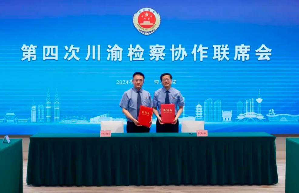 2024年7月18日,第四次川渝检察协作联席会在四川省广安市召开,重庆市检察院、四川省检察院会签《关于支持和服务保障川渝高竹新区高质量发展的意见》和《协同打造川渝地区检察机关区域法治一体化样板工作方案》,共同出台42条举措。图为签约仪式现场。(四川省检察院供图)