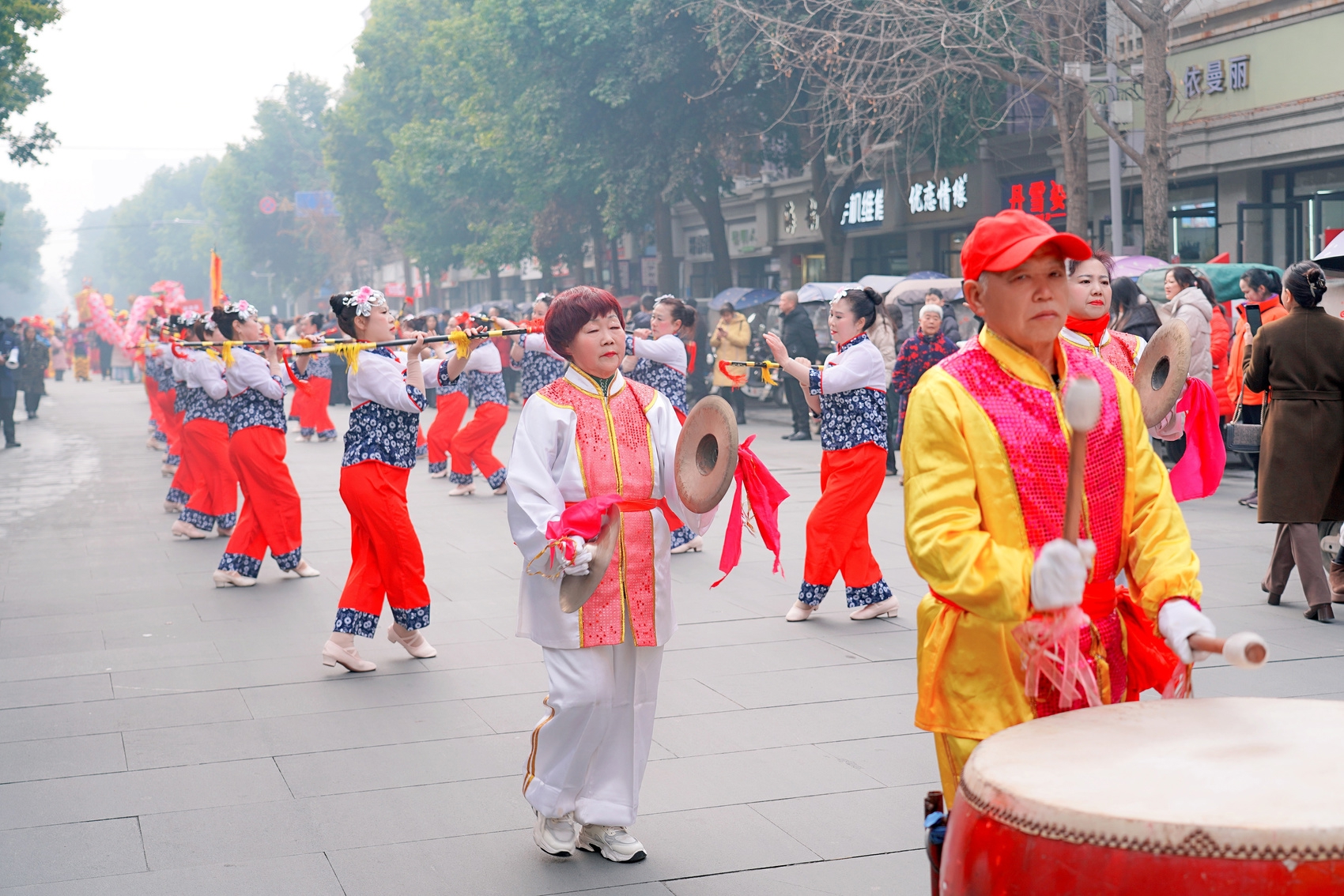 城厢镇槐树街社区朝阳舞蹈队为前来城厢古城过大年的市民们献上过街连萧表演。
