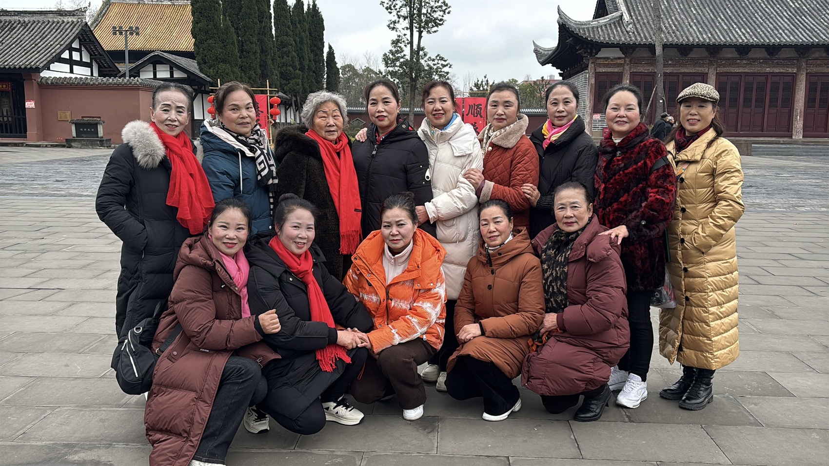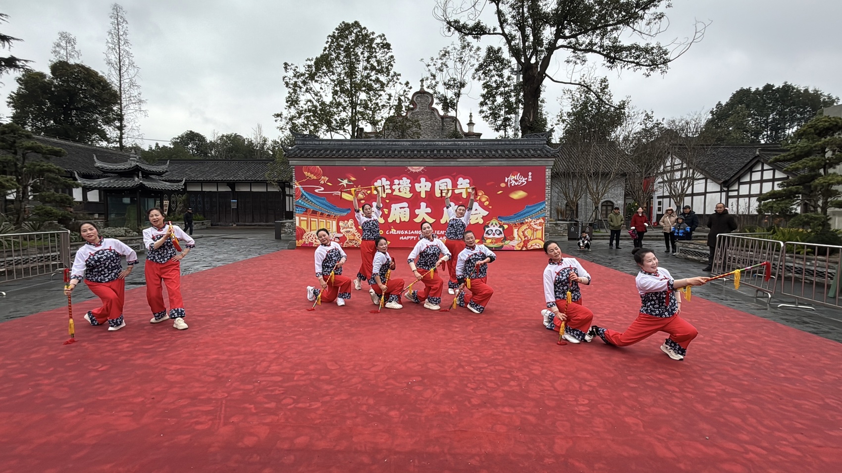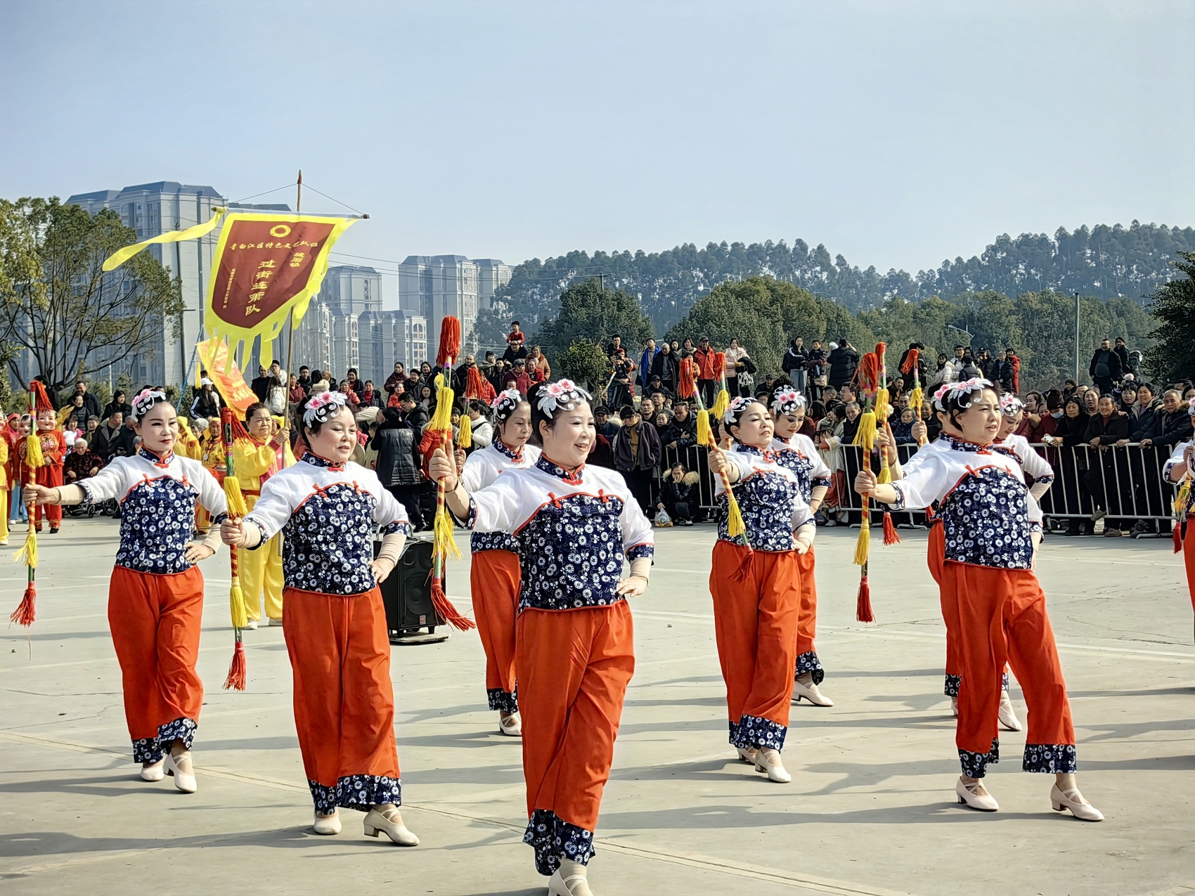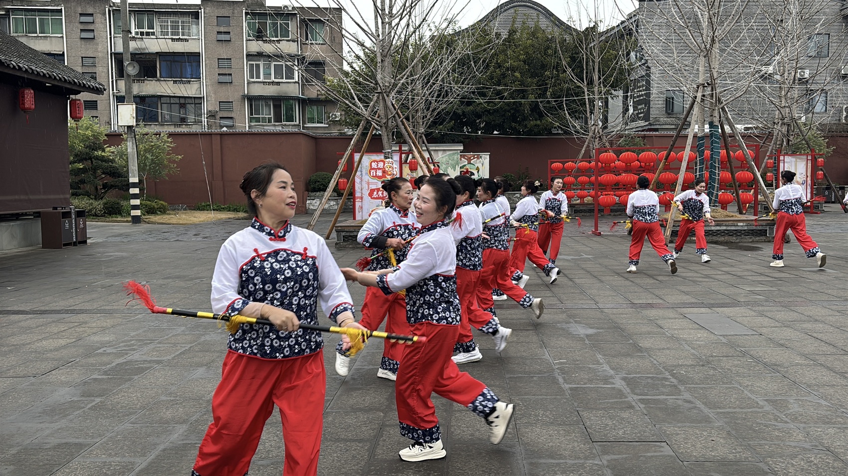 青白江区“过街连萧”是市级非物质文化遗产,表演时由数个舞者领唱小调,众舞者齐唱闹词。舞者边唱边舞动连萧棍,用碰、点、踢、拍、转、抖等手法与身法击打身体肩、胸、腰、背、腿、脚等各个部位,使连萧棍发出“哗哗”声响。今年春节,2025年“成都文化四季风·民俗闹春”龙狮巡游市级主题展示活动在青白江区城厢古城上演,城厢镇槐树街社区朝阳舞蹈队与小金龙、板凳龙等民俗展演一起,为前来城厢古城过大年的市民们献上了一整天的过街连萧表演。