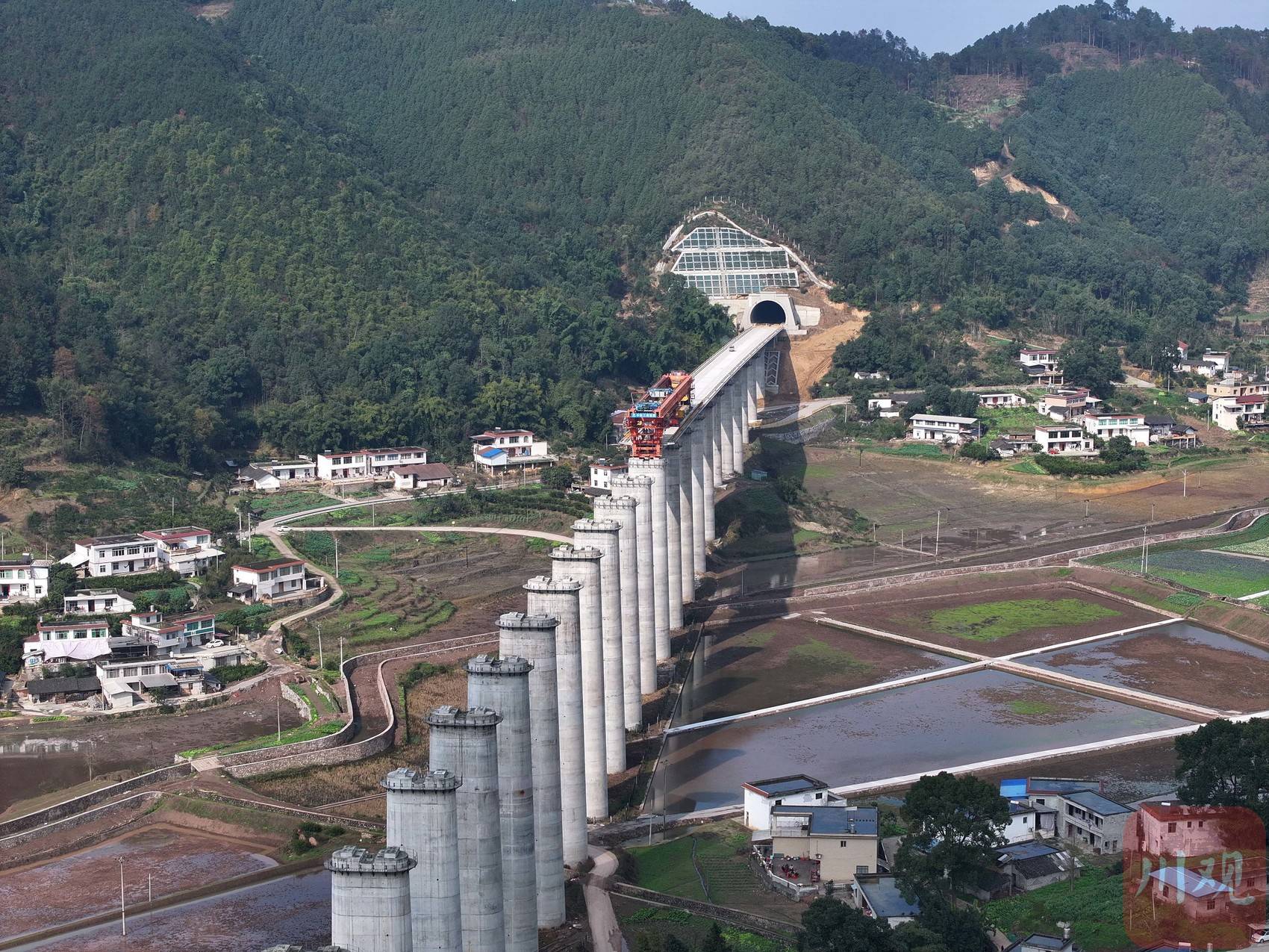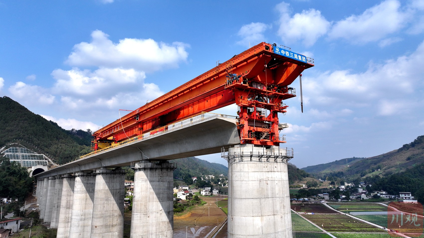 2月10日,在位于高县庆岭镇境内的渝昆高铁川渝段站前六标项目马鞍山特大桥施工现场,工人们正在紧张有序地进行箱梁架设工作。大桥全长951米,目前,桥梁下部结构已全部完工,架梁已完成11孔长度352米,剩余18孔共599米,预计在本月底架设完毕。