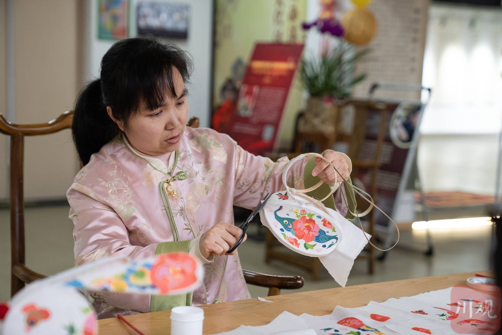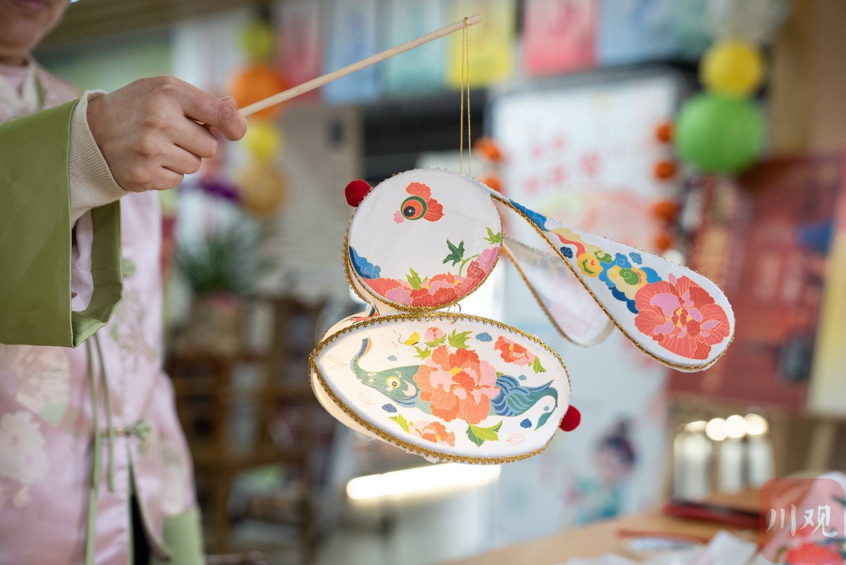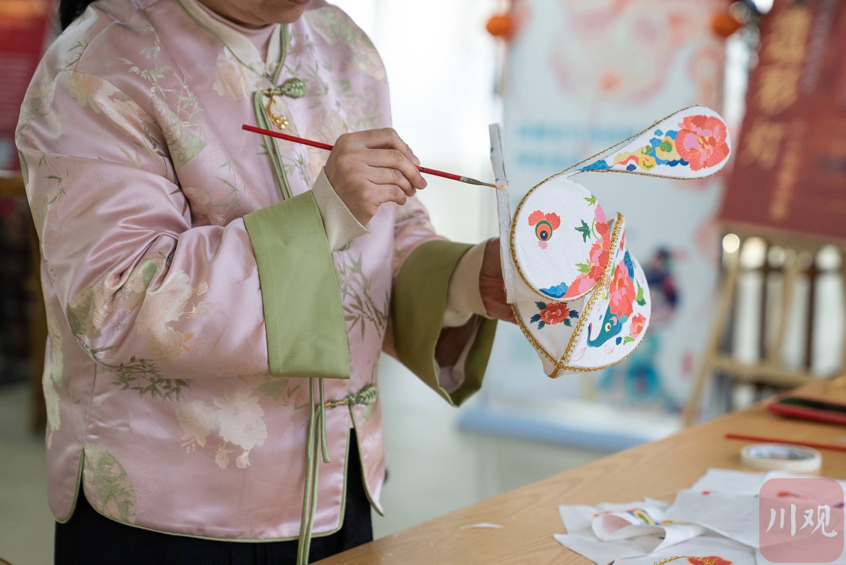 2月11日下午,四川成都,黄樱樱在用印有自己设计的图案的亚麻布对兔子灯进行裱糊。
