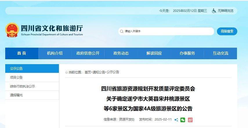 2月11日,四川省文化和旅游厅网站发布公告,依照《旅游景区质量等级的划分与评定》国家标准,由各市(州)推荐,四川省旅游资源规划开发质量评定委员会按程序组织综合评定,确定以下6家旅游景区为国家4A级旅游景区。名单如下: