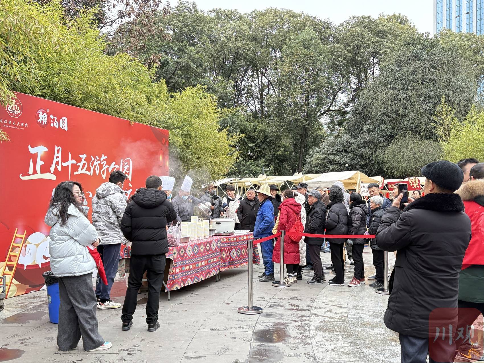 2月12日,正月十五元宵佳节,成都市人民公园内热闹非凡,一场充满温情的送汤圆活动在辛亥保路纪念广场暖心上演,为市民和游客营造出浓郁的节日氛围。