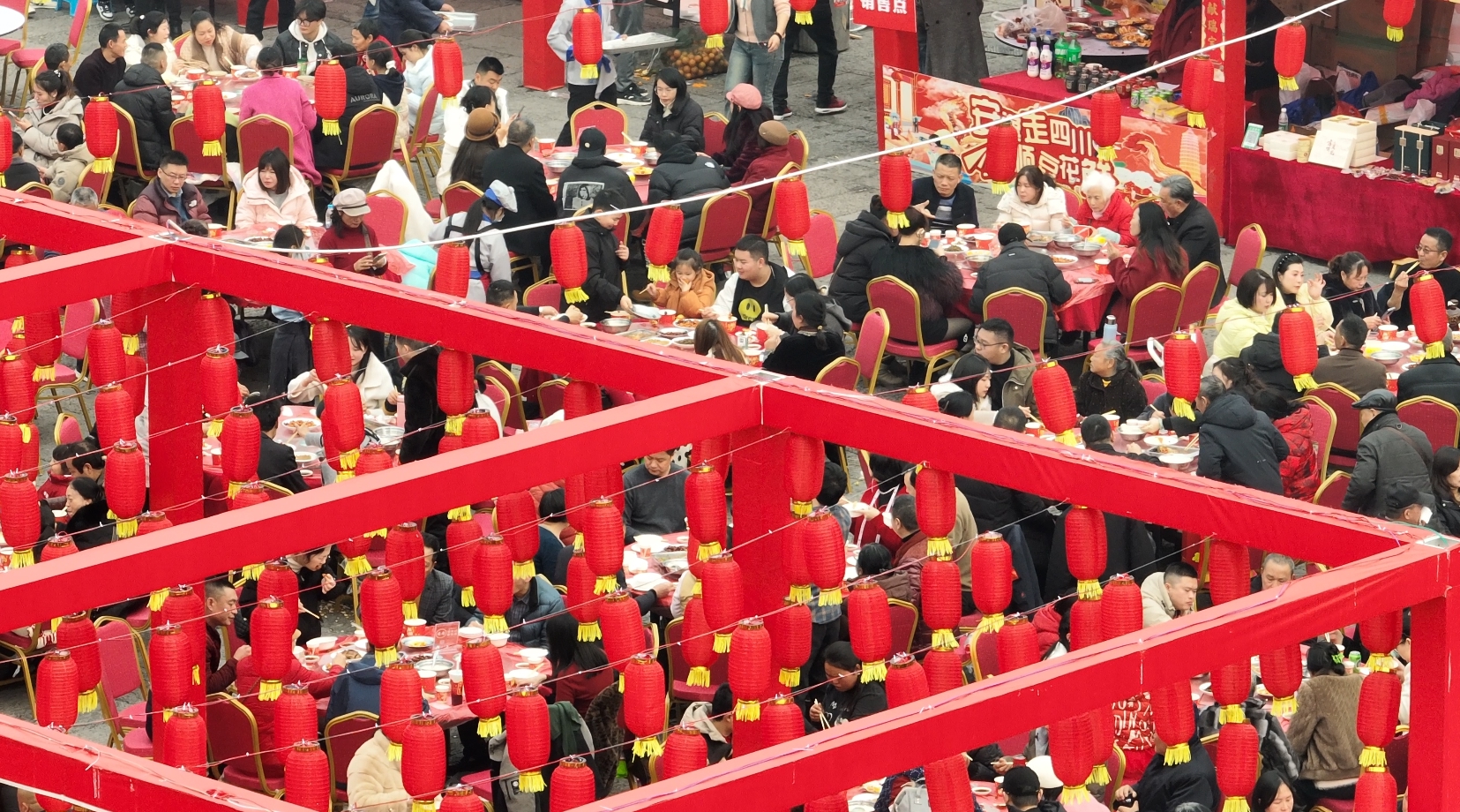近日,富顺县文庙广场摆开一场千人豆花宴,吸引游客围坐品尝。豆花白嫩、扣碗飘香,一口豆花蘸上秘制蘸料,鲜香直抵舌尖。“吃到这个家乡味道,才有过年的感觉。”从外地返乡过年的李思远说。
