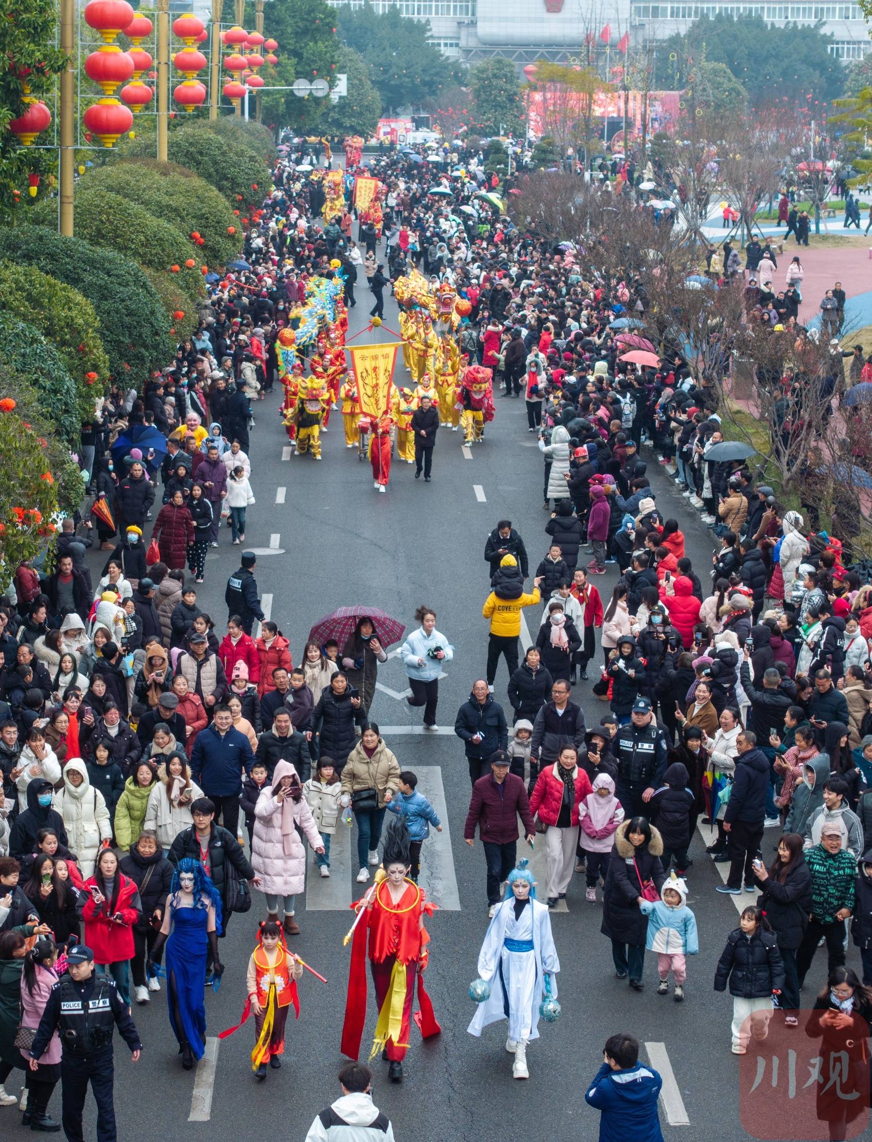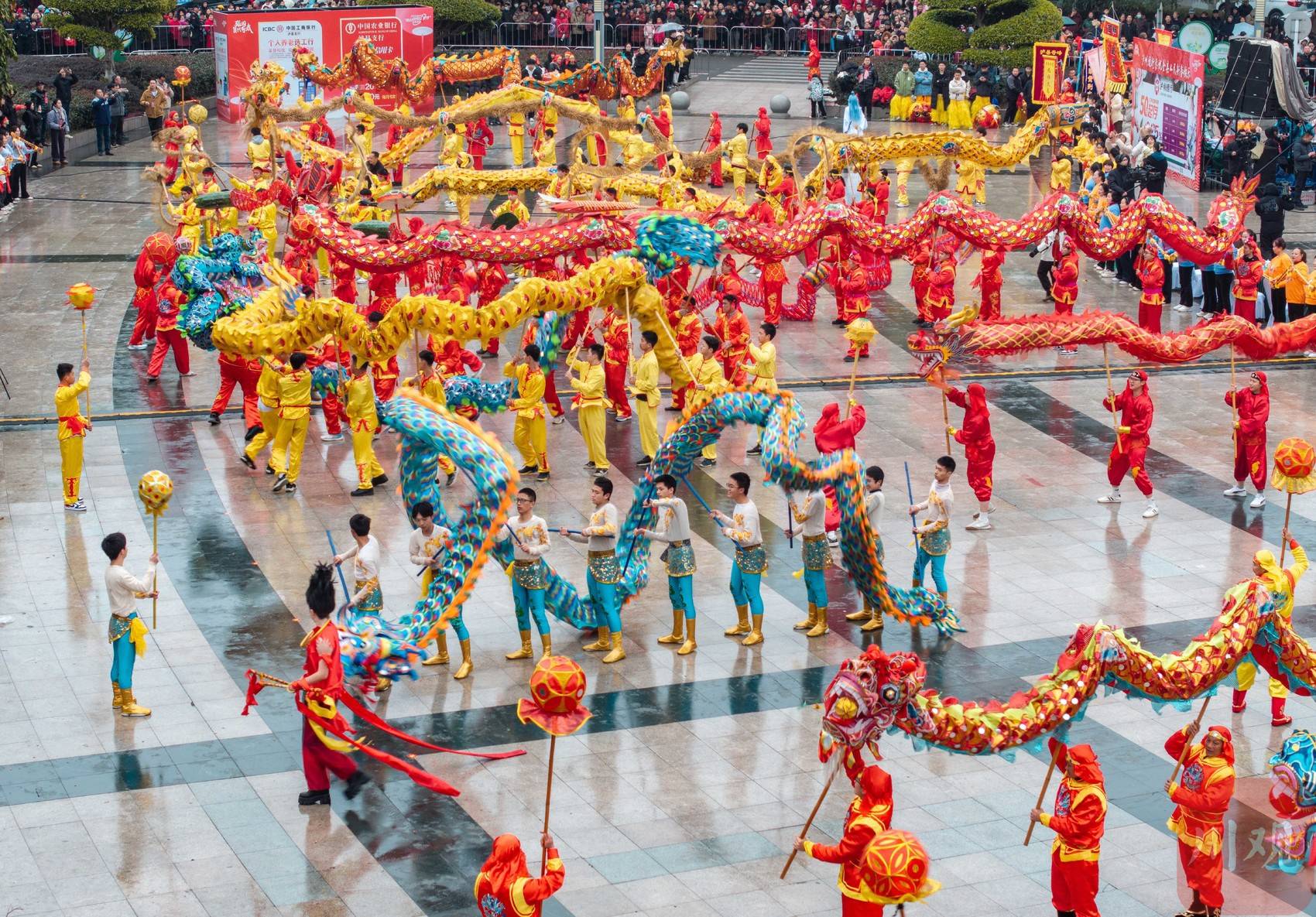 2月12日,传统元宵佳节,来自泸州市泸县全县各乡镇的龙舞队伍与重庆铜梁的龙舞队伍,齐聚县城人民广场和县城干道巡游表演,为全县百姓上演了一场舞龙视觉盛宴。其中,最让人惊喜的是,哪吒、敖丙、敖闰真人cosplay演员也来到闹元宵现场,与群龙一起巡游,成为最受欢迎的节目。
