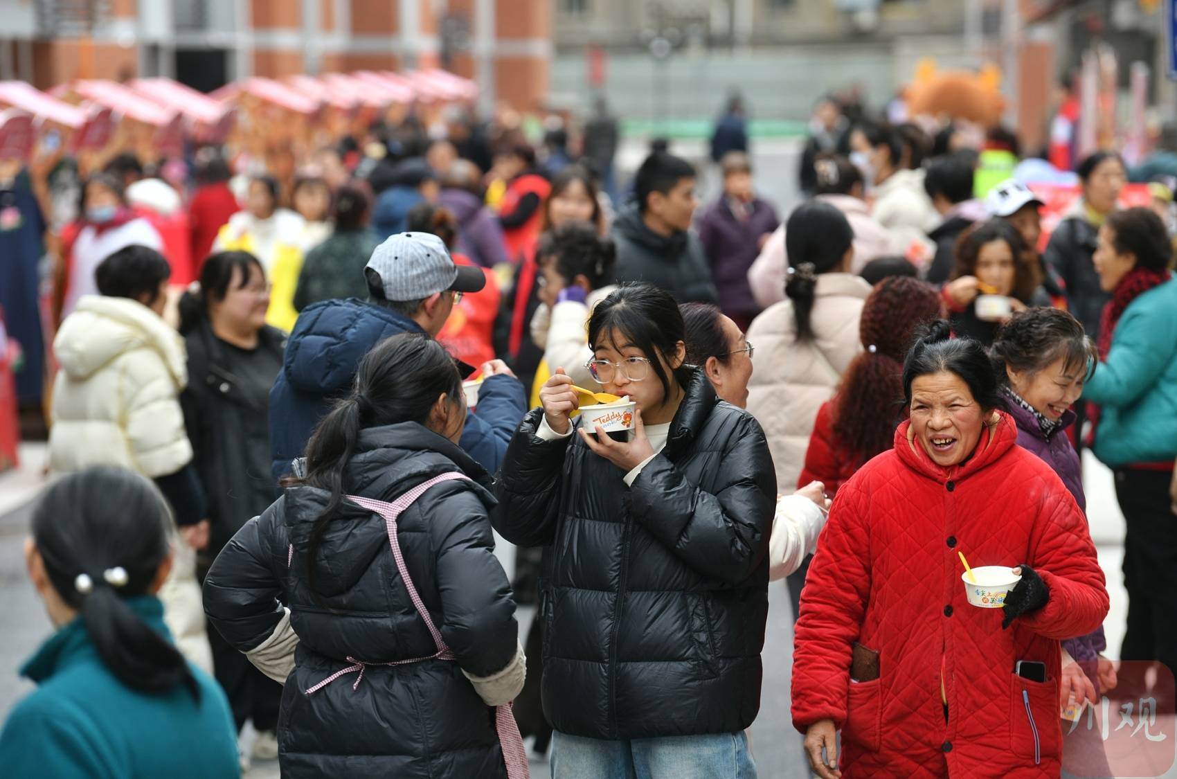 2月12日元宵佳节,下午3点,在成都老城区里的工人村社区,一场热热闹闹的非遗集市在新建居民楼前开启。现场不仅有促销的助农产品,蜀绣、年画、剪艺、糖艺等非遗摊位前也围满了居民,新春游园趣味活动区域更是吸引了社区的小朋友们,滚铁环、踢毽子、投壶、垃圾分类飞行棋……现场笑声不断。