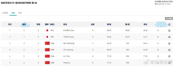 △单板滑雪女子U型场地技巧预赛第2轮,中国选手武绍桐排名第三。