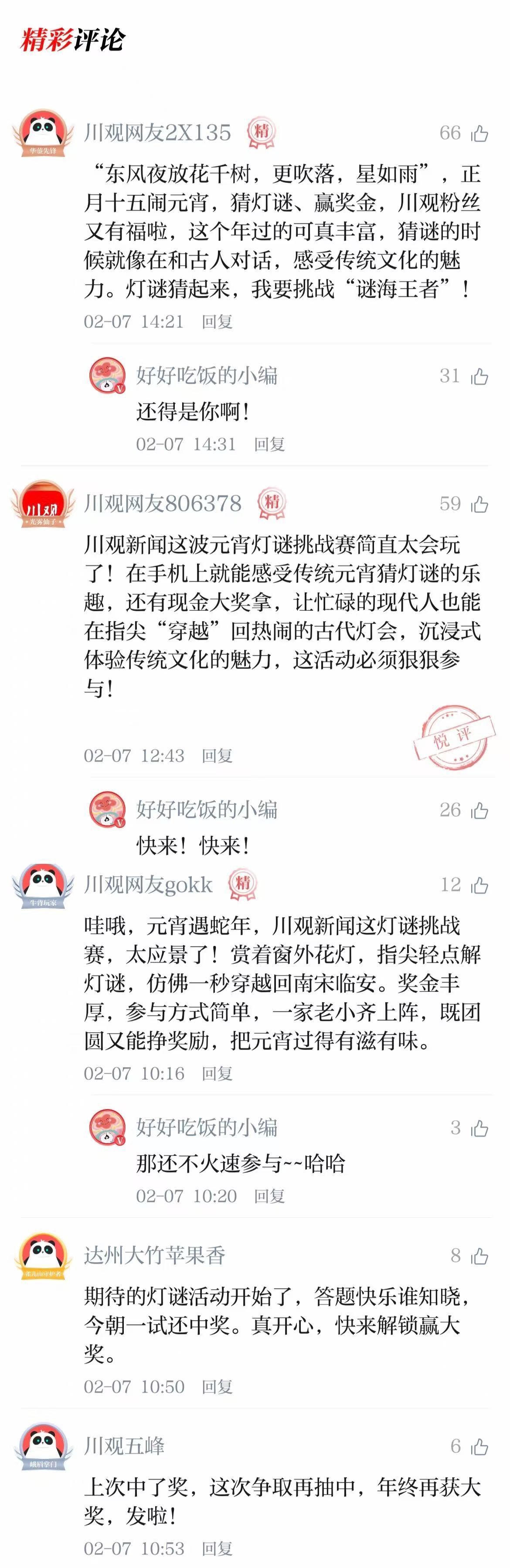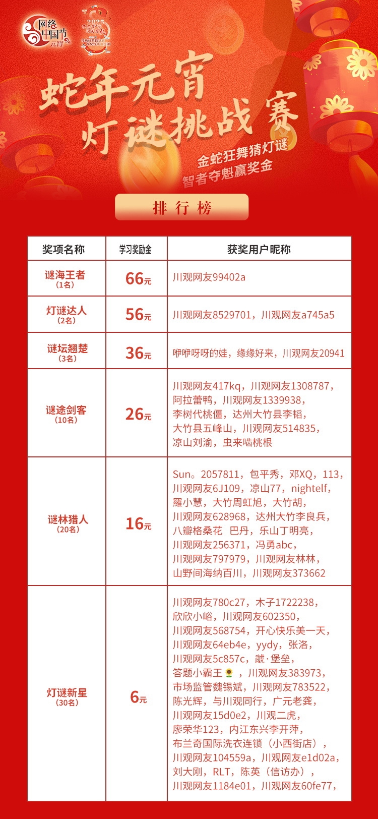 PS,已获得“蛇年新春传统文化争霸赛”排名奖的用户,不参与本次“蛇年元宵灯谜挑战赛”排名。本次活动积分按比例计入2025年“网络中国节”“巳巳如意闯关有礼”活动总排行榜。待今年重阳节活动结束后,将对总排行榜排位靠前的用户作出奖励。