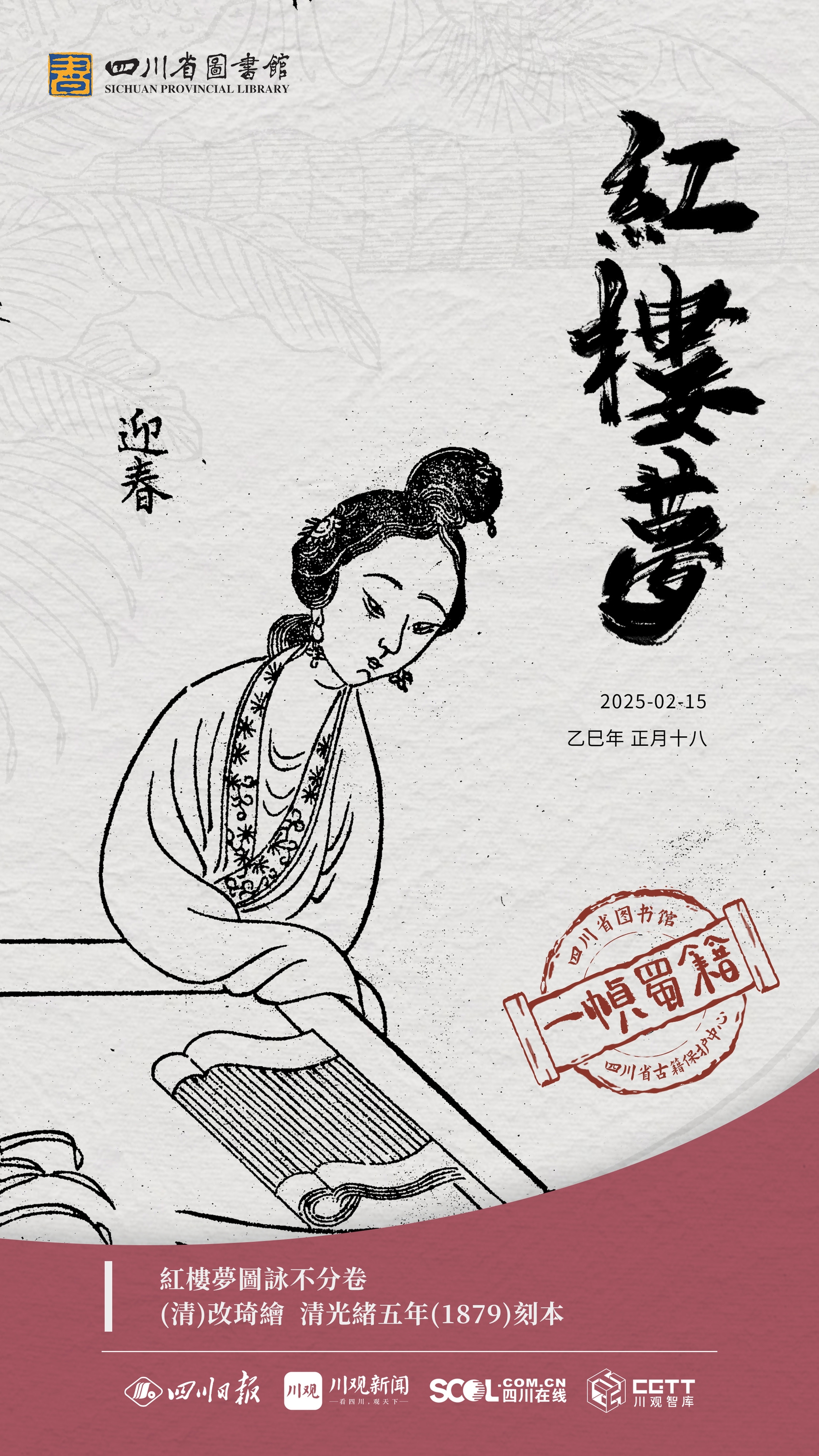 2月15日,一帧蜀籍带您走进红楼梦人物图之迎春。海报所选用图源于《红楼梦图咏不分卷》,(清)改琦绘图,清光绪五年(1879年)刻本。