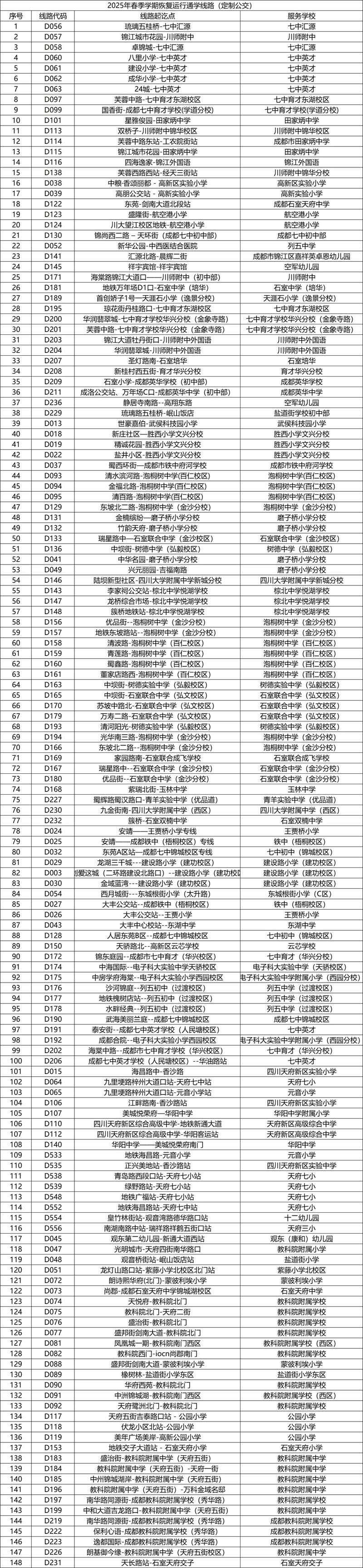 新学期,成都公交通过提前与家委会、家校群等沟通,了解学生出行需求,将在开学第一天全面恢复开行全市148条通学定制专线,服务成都七中初中学校、教科院附属中学、泡桐树中学、树德实验中学、电子科大实验中学、列五中学等100余所学校(校区)学子们通学出行。