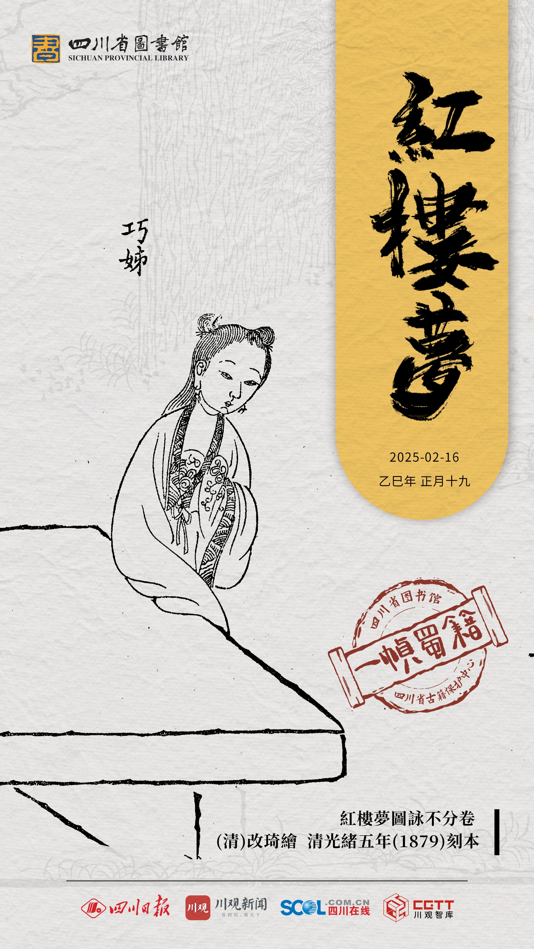 2月16日,一帧蜀籍带您走进红楼梦人物图之巧姐。海报所选用图源于《红楼梦图咏不分卷》,(清)改琦绘图,清光绪五年(1879年)刻本。