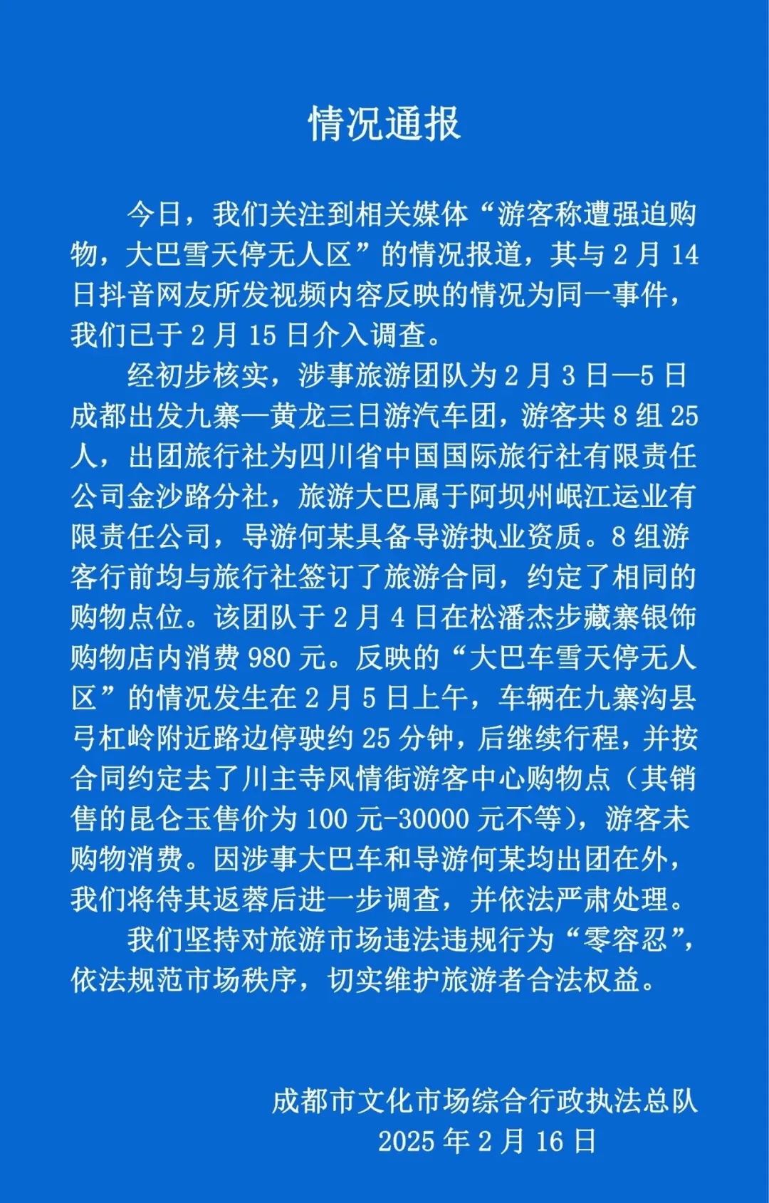 近日,有媒体报道“游客称遭强迫购物,大巴雪天停无人区”,2月16日,成都市文化市场综合行政执法总队发布情况通报如下: