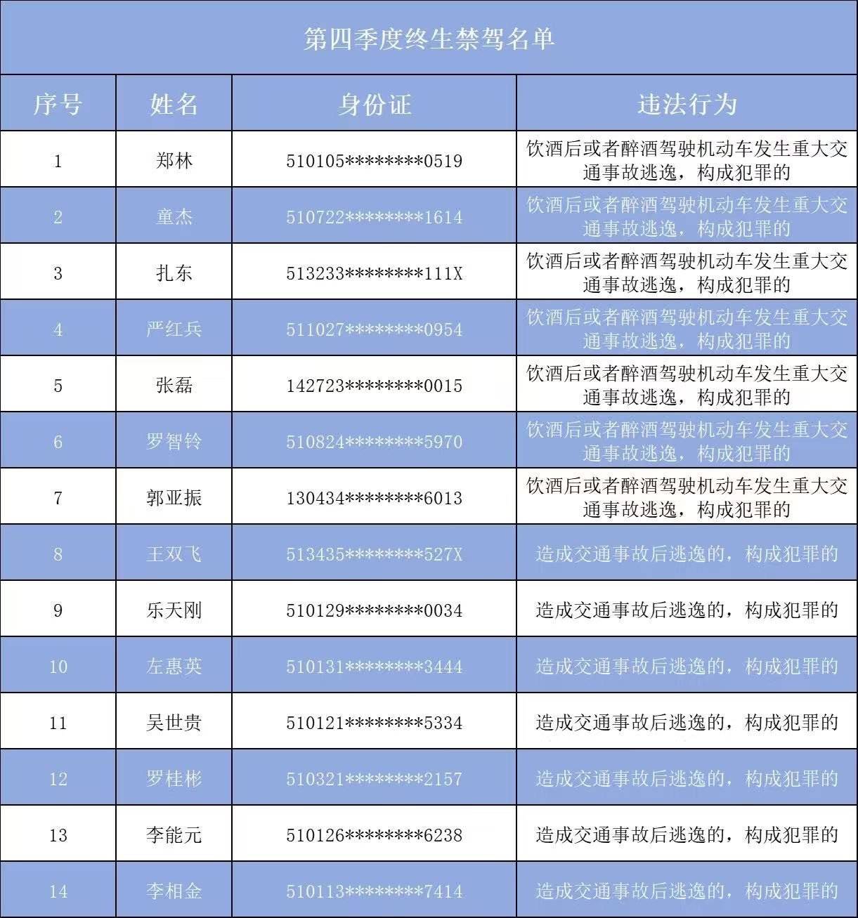 2024年第四季度,成都共计14人被依法吊销机动车驾驶证,且终生不得重新申领。其中,年龄最大的59岁,年龄最小的29岁;有7人因“造成交通事故后逃逸构成犯罪的”被终生禁驾,有7人因“饮酒后或者醉酒驾驶机动车发生重大交通事故逃逸,构成犯罪的”被终生禁驾。
