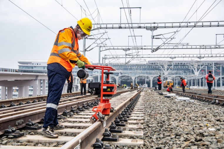 2月18日,在重庆东站建设施工现场,铁路工人在对线路进行精调作业。