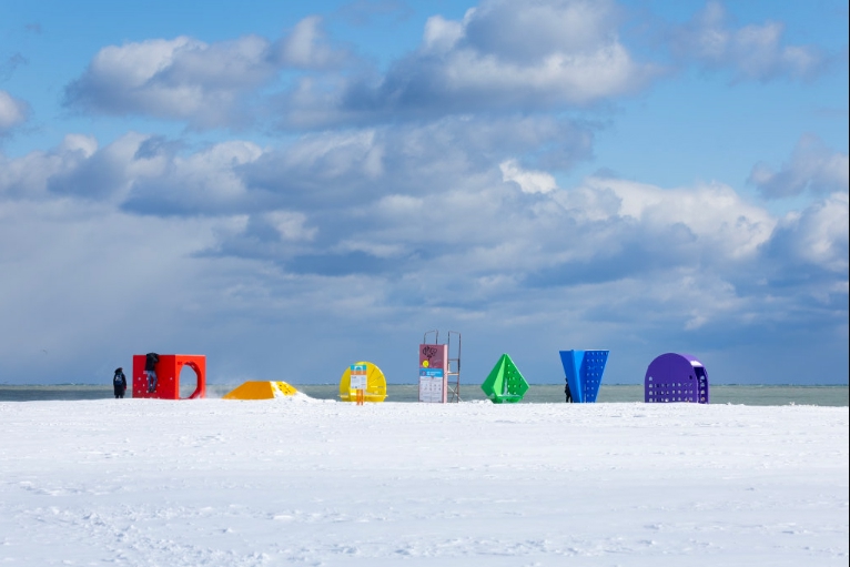 当日,多伦多2025年“冬季小筑”国际设计比赛获奖作品在安大略湖畔展出。“冬季小筑”是一项以水岸救生员岗亭为基础的年度国际设计比赛。