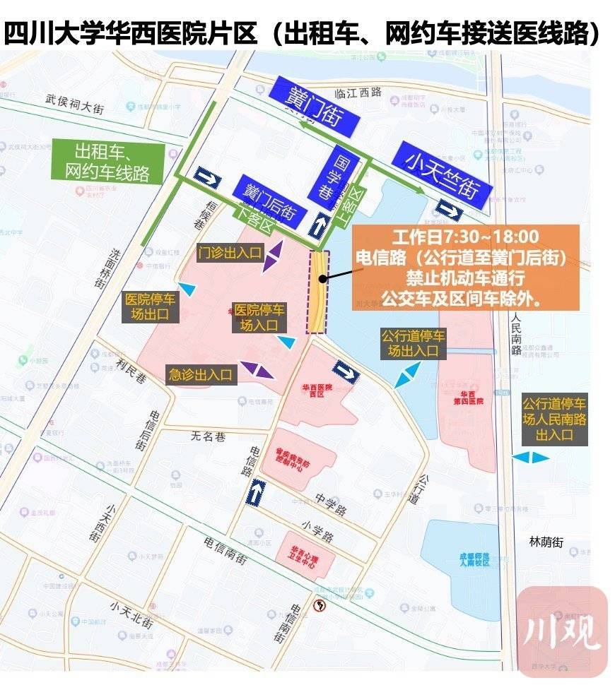 四川大学华西医院东1门到东3门前长约200米的道路(电信路公行道至黉门后街段)在工作日(含法定节假日调休的工作日)每日7:30-18:00禁止机动车通行(公交车与区间车除外)。