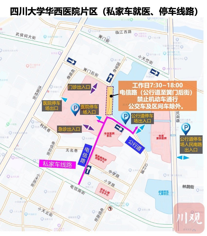 在此温馨提醒市民:如驾车前往华西医院,可导航至电信路华西医院停车场东入口,如停车场已满可右拐至公行道停车场。为避免停车排队,市民还可从人民南路进入华西公行道停车场后,乘坐免费摆渡车返回华西公行道停车场出入口。