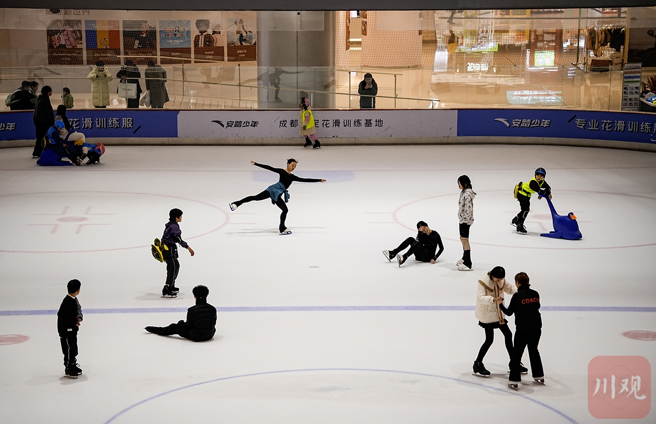 成都市锦江区,冰上运动吸引了众多青少年们踊跃参与。