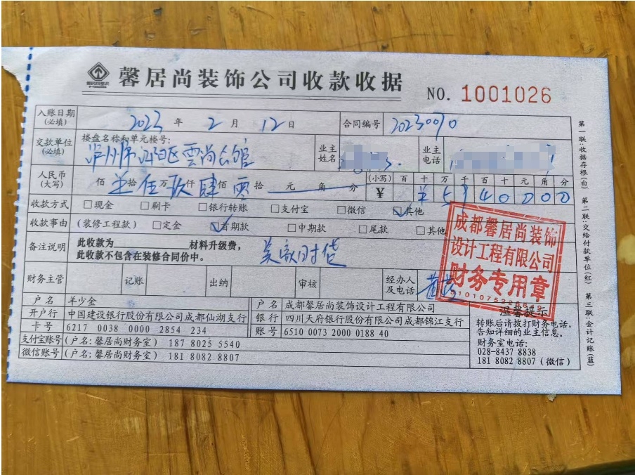 据王女士介绍,2023年2月,她与馨居尚签订装修合同,将自己位于泸州市江阳区雲尚公馆的新房交给该公司装修,工程造价为19.8万元,由馨居尚提供整装服务,包工、包全部材料。“我们先期支付了5.94万元的首期款,后来陆续又支付了一些款项,去年9月交房后他们进场开工装修,今年春节前,供货商突然找我要货款,我才知道他们根本没有付钱给供货商。当时馨居尚的人说年后开工,结果年后装修工人告诉我没法开工了,公司已经垮了。”