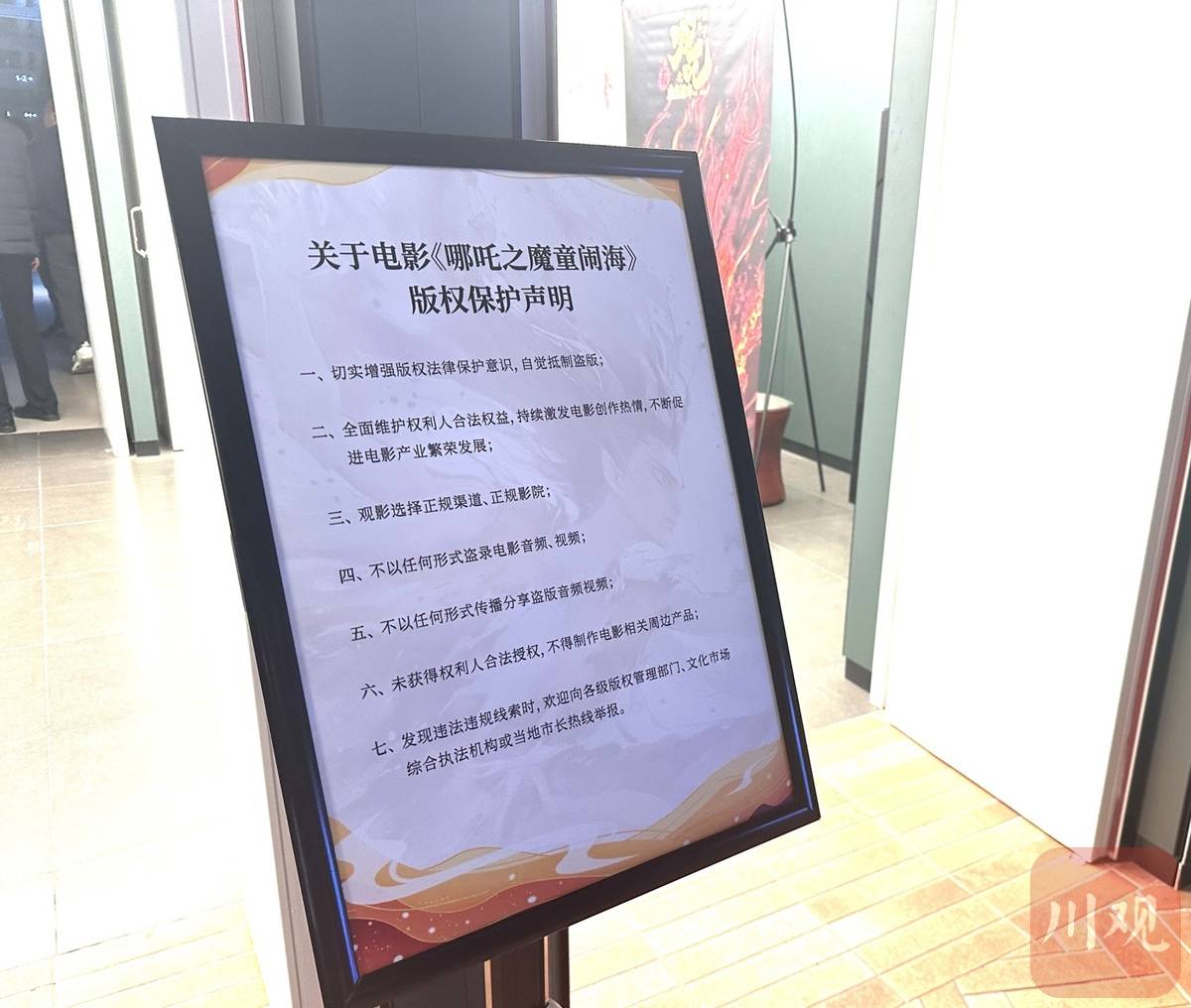 此前,四川省版权局、四川省文化和旅游厅共同发布关于电影《哪吒之魔童闹海》版权保护的公告引发广泛关注,呼吁全社会要切实增强版权法律保护意识、自觉抵制盗版,全面维护权利人合法权益,包括不以任何形式盗录电影音频、视频,不以任何形式传播分享盗版音频视频,未获得权利人合法授权不得制作电影相关周边产品等内容。