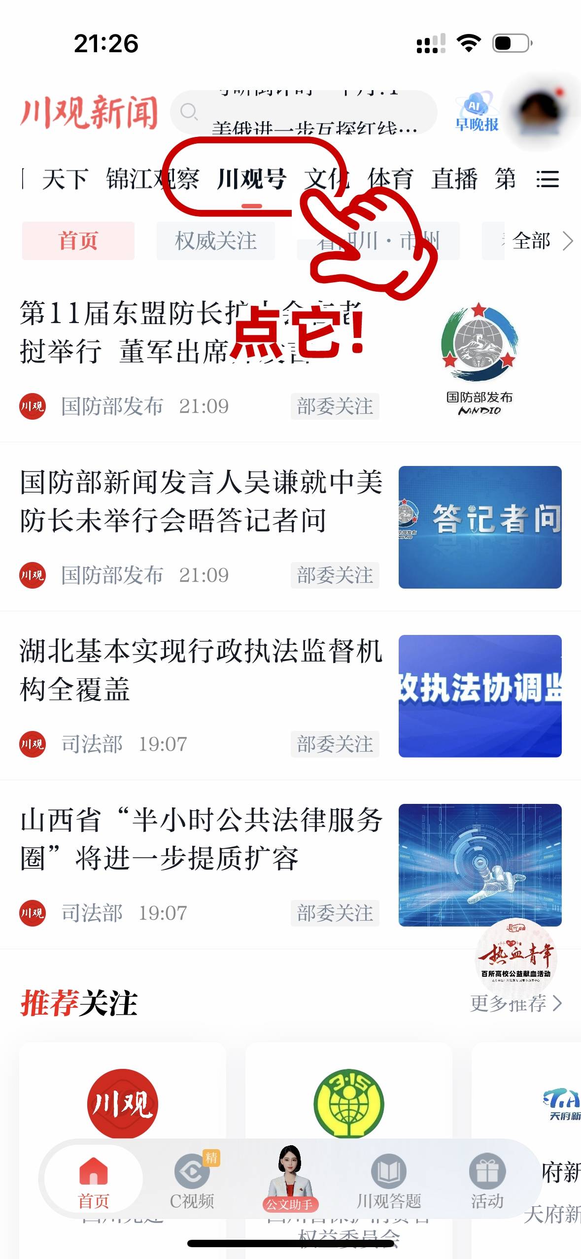 ①打开川观新闻客户端,首页向左滑动导航栏,找到“川观号”,点击进入。