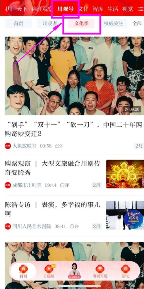 ②在“川观号”频道页面,点击导航栏“文化季”即可进入。