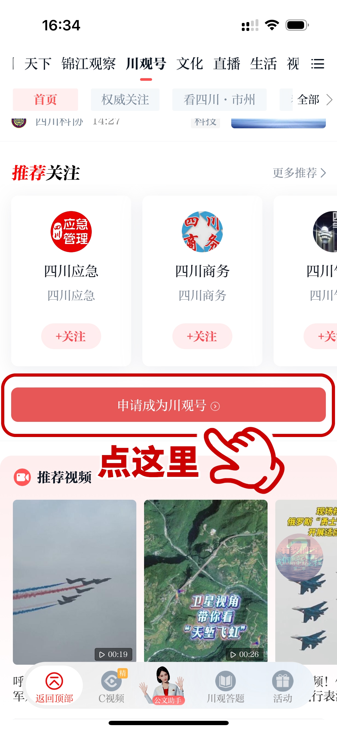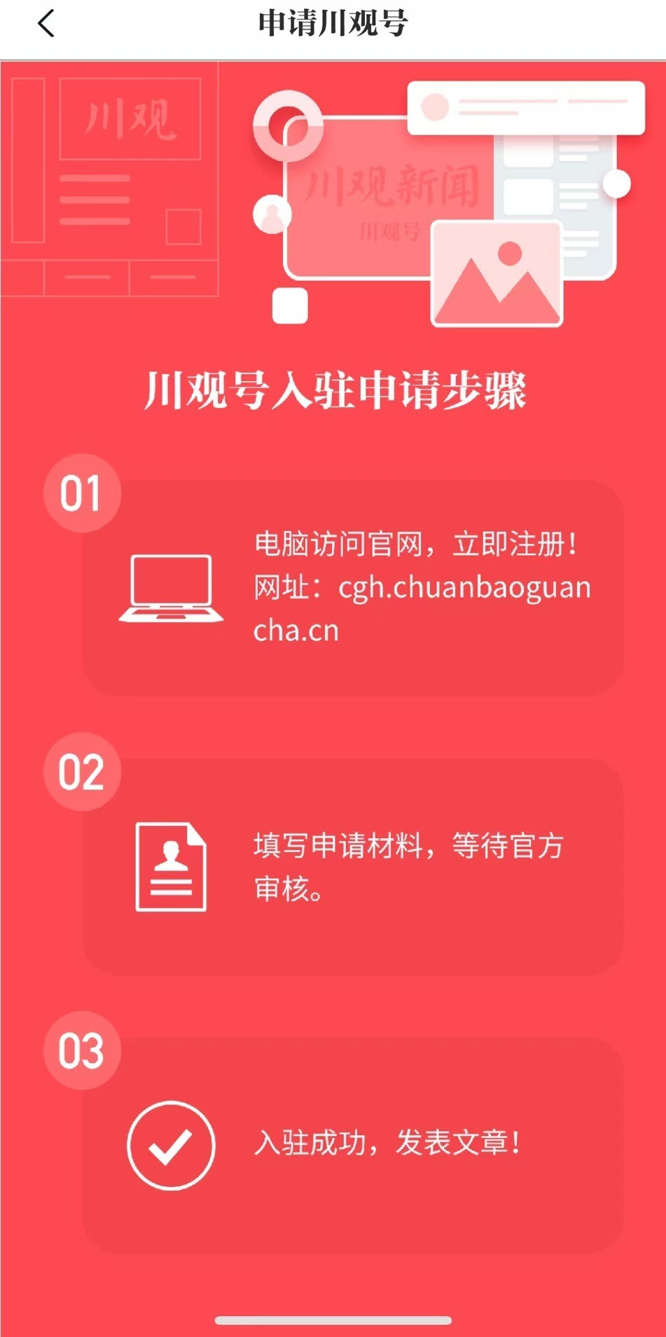 ①进入“川观号”频道页面,下滑找到“申请成为川观号”,点击进入。