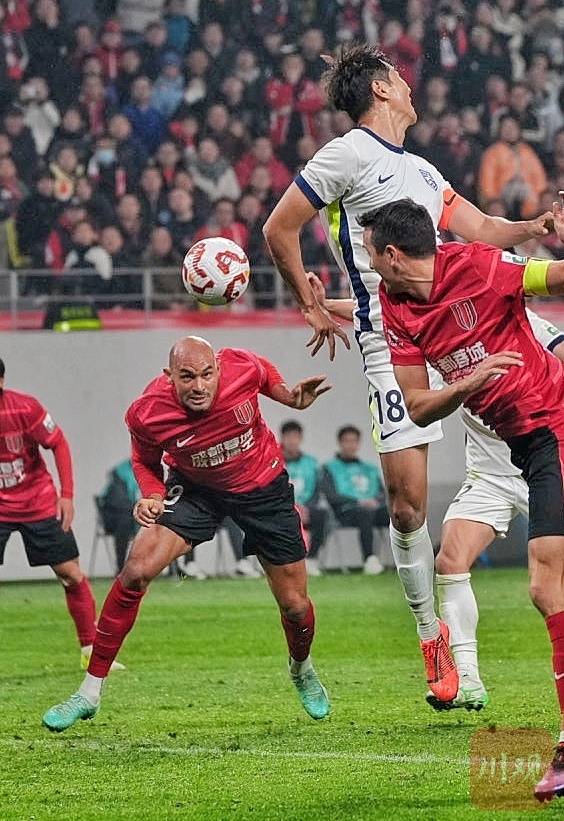 成都蓉城队员费利佩禁区头球抢点。