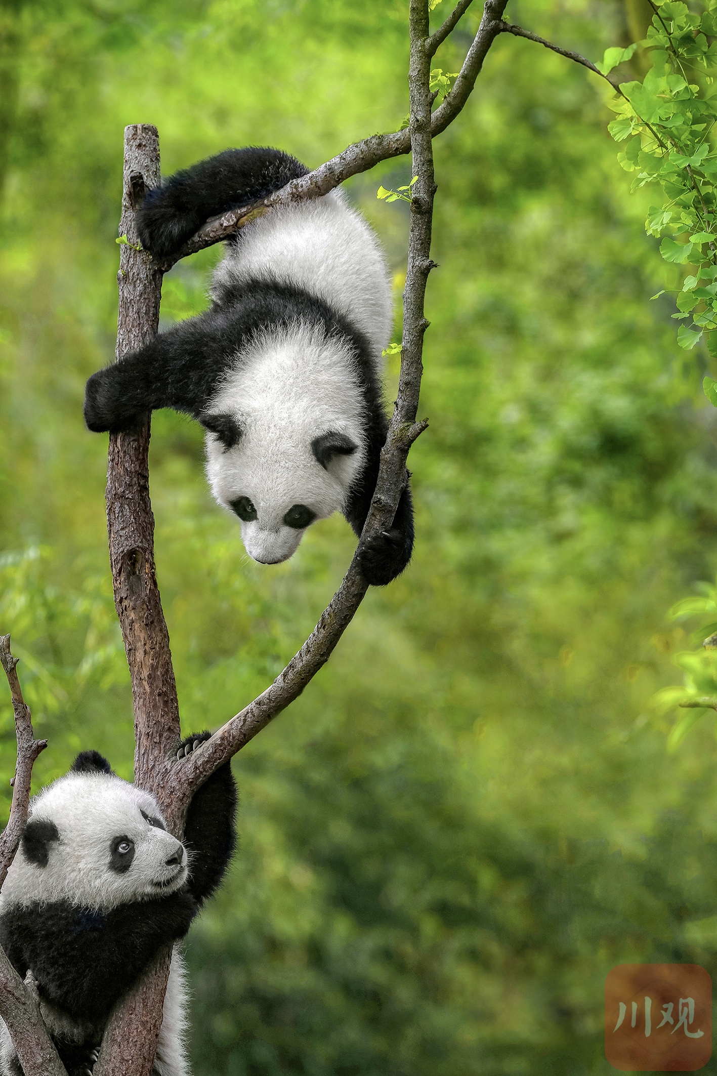 瞧这哥俩!熊猫的树上 “功夫秀”。