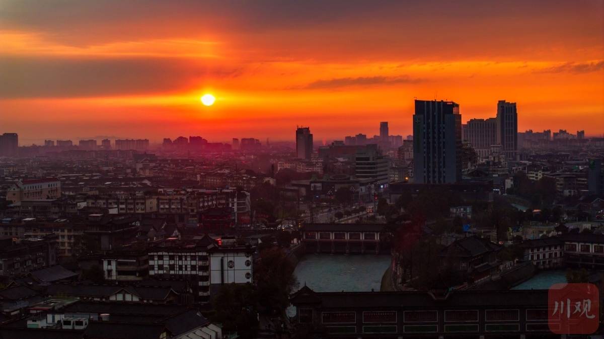 2月25日,成都雨后天晴。初升的旭日照亮了都江堰古城。C视觉 韦洪涛 摄