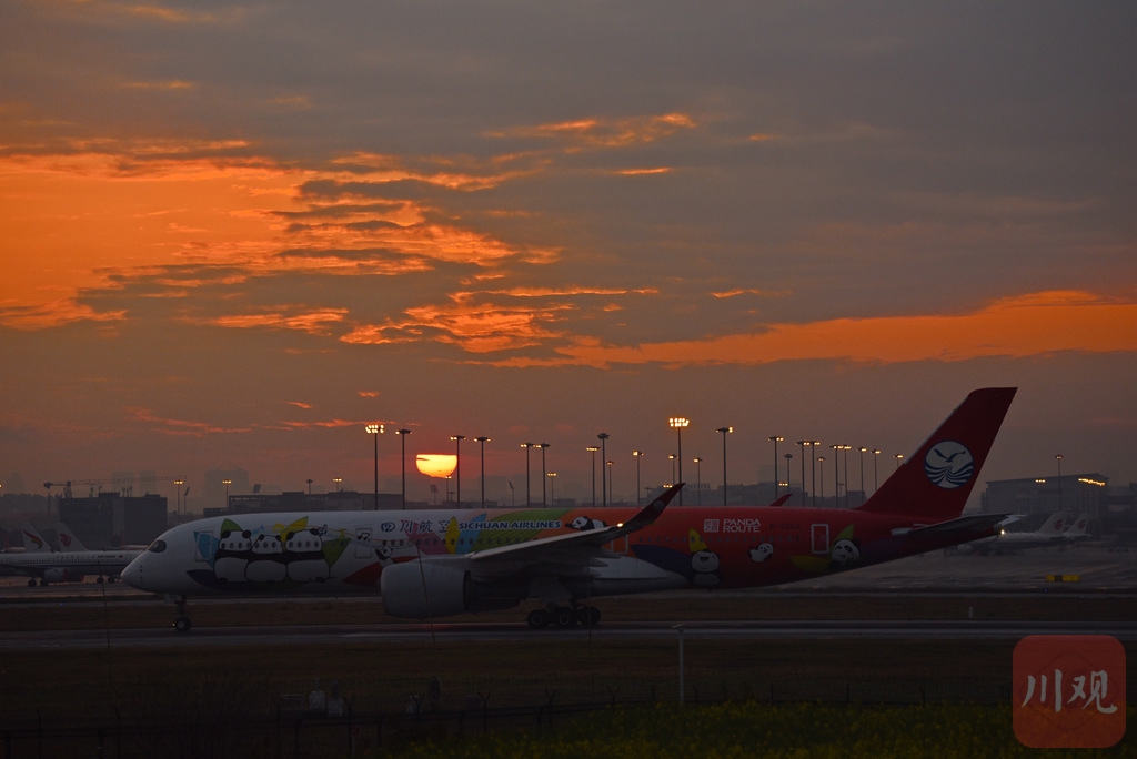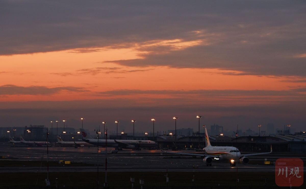 2月25日,成都雨后天晴。成都双流国际机场沐浴在灿烂的朝霞中,城市迎来生机勃勃的新一天。C视觉 钟树军 摄